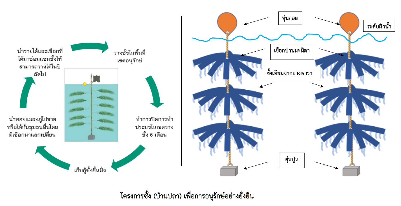 ทีมงานยังได้เล่าถึงที่มาของความคิดเนื่องจากปัญหาการลดลงของทรัพยากรสัตว์น้ำในพื้นที่ซึ่งส่งผลกระทบต่อทุกคน โดยเฉพาะชุมชนประมงชายฝั่งซึ่งมีรายได้จากทรัพยากรทางทะเลเป็นหลัก ทำให้ชุมชนมีความต้องการที่จะจัดทำโครงการเพื่ออนุรักษ์และฟื้นฟูทรัพยกรทางทะเล แต่การทำงานอนุรักษ์ต่าง ๆ นั้นต้องอาศัยทุนทรัพย์ซึ่งเป็นจำนวนไม่น้อยและเป็นค่าใช้จ่ายต่อเนื่อง ฝ่ายพัฒนาความยั่งยืนฯ จึงได้ริเริ่มแนวทางการทำงานอนุรักษ์รูปแบบใหม่ที่จะทำให้ชุมชนมีรายได้หมุนเวียนเพื่องานอนุรักษ์อย่างยั่งยืน โดยได้ร่วมกับชุมชนจัดทำซั้ง (บ้านปลา) เพื่อเป็นแหล่งอนุบาลและแหล่งที่อยู่อาศัยของสัตว์น้ำ ซึ่งโดยทั่วไปแล้วการทำซั้งจะมีการกำหนดกติกาการใช้ทรัพยากรอย่างมีความรับผิดชอบร่วมกัน เช่น มีการกำหนดเขตพื้นที่และระยะเวลาเพื่อการอนุรักษ์ที่จะมีการจำกัดกิจกรรมทางประมงเพื่อให้สัตว์น้ำได้ขยายพันธุ์และเจริญเติบโตต่อไป เมื่อถึงเวลาที่กำหนดชาวประมงก็จะสามารถไปใช้ประโยชน์จากบริเวณซั้งได้ตามปกติ และซั้งก็จะถูกทิ้งให้ย่อยสลายไปตามธรรมชาติ