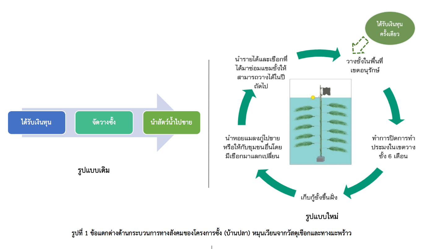ในขณะที่รูปแบบการดำเนินการทั่วไปนั้น เป็นการลงทุนแบบครั้งต่อครั้งและไม่ก่อให้เกิดรายได้หมุนเวียน ชุมชนต้องพึ่งพาหน่วยงานภายนอกเสมอ 2) นวัตกรรมทางเทคโนโลยี คือการคิดค้นรูปแบบการทำซั้งขึ้นมาใหม่ โดยการใช้สิ่งเหลือใช้จากการผลิตของบริษัท (เช่น เปลือกไข่) และยางพาราที่เป็นวัตถุดิบท้องถิ่นที่หาได้ง่าย สร้างเป็นซั้งที่มีคุณสมบัติที่เป็นมิตรต่อสิ่งแวดล้อมและทดทาน ซึ่งเมื่อเปรียบเทียบกับรูปแบบทั่วไปที่ใช้วัสดุธรรมชาติที่ย่อยสลายในเวลาเพียง 1-2 เดือน หรือการนำเชือกใยยักษ์มาที่มีส่วนผสมของพลาสติกมาใช้นั้น ซั้งรูปแบบใหม่ส่งผลให้ชาวประมงลดค่าใช้จ่าย 2.2 เท่า จากการลงทุนลงแรงในการทำซั้งและยืดอายุซั้งเทียมไปถึงประมาณ 5 ปี และยังช่วยลดปัญหาไมโครพลาสติกในทะเลอีกด้วย