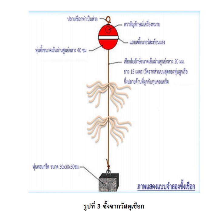 นวัตกรรมด้านเทคโนโลยี (Innovative Technology) รูปแบบของซั้งในปัจจุบันผลิตขึ้นจากวัสดุ 2 รูปแบบ ได้แก่ 1. ซั้งจากวัสดุธรรมชาติ เช่น ทางมะพร้าว ทางจาก หรือกิ่งไม้ (รูปที่ 2) 2. ซั้งจากวัสดุเชือก เช่น เชือกใยยักษ์ (รูปที่ 3) โดยวัสดุทั้ง 2 รูปแบบ มีจุดอ่อนของวัสดุ เช่น ซั้งจากวัสดุธรรมชาติจะไม่ความคงทน ย่อยสลายได้ง่ายมีอายุเพียง 1-2 เดือนเท่านั้น ส่วนซั้งจากวัสดุเชือก แม้จะมีความคงทนกว่าซั้งจากวัสดุธรรมชาติ แต่เมื่อเชือกมีการย่อยสลายจะกลายเป็นปัญหาไมโครพลาสติก ดังนั้น แนวความคิดของซั้งรูปแบบใหม่หรือที่เรียกว่า ซั้งเทียม (บ้านปลา) จากยางพาราและวัสดุเหลือใช้จากกระบวนการผลิตของฟาร์มไก่ไข่ ซึ่งมีข้อดีเรื่องของการเลือกใช้วัสดุจากธรรมชาติและบางส่วนเป็นวัสดุที่เหลืองใช้จากฟาร์ม อีกทั้งคุณสมบัติของยางพารามีความคงทนและแข็งแรงมากกว่า 5 ปี และการนำยางพารามาใช้งานเป็นการช่วยเกษตรกรชาวสวนยางที่ได้รับความเดือดร้อนจากราคายางตกต่ำ และสำคัญที่สุดคือซั้งเทียมไม่มีการปลดปล่อยสารเคมีออกสู่ทะเลและไม่มีปัญหาไมโครพลาสติก