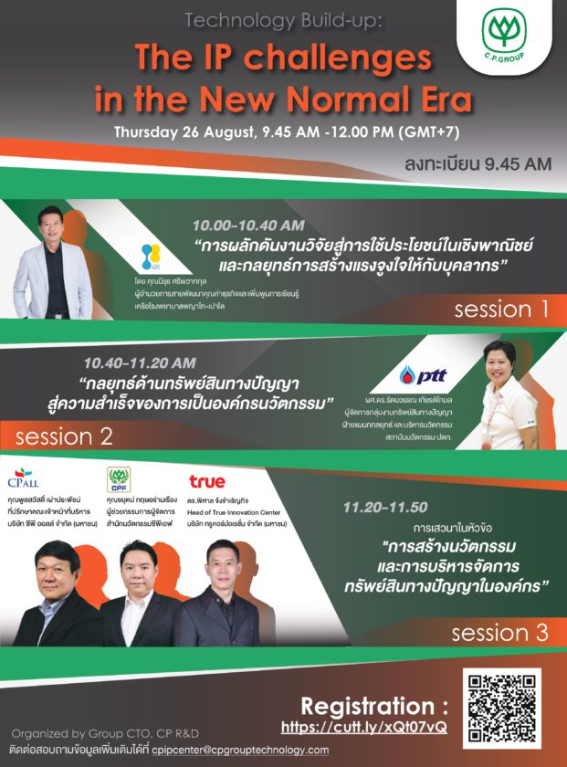 Group CTO Office เครือเจริญโภคภัณฑ์ มีกำหนดจัดงานสัมมนาออนไลน์ CPG Technology Build-up Program ครั้งที่ 3 ประจำปี 2564 โดยในครั้งนี้ได้จับมือกับ CP IP Service Center จัดกิจกรรมสัมมนาในหัวข้อ “The IP challenges in the New Normal Era” ขึ้นในวันพฤหัสบดีที่ 26 สิงหาคม 2564 เวลา 09.45 – 12.00 .