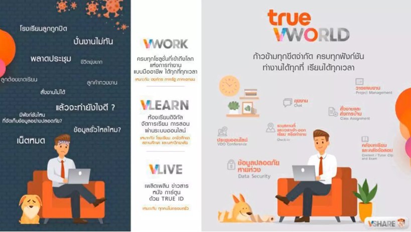 เราได้สร้างโซลูชันแพลตฟอร์ม แรกในโลก ที่มีฟังก์ชันการใช้งานครบทุกด้าน ภายใต้คอนเซปต์ “True Virtual World” หรือ “True VWorld” พาทุกคนก้าวผ่านสู่โลกใหม่ของชีวิตครบโซลูชัน พร้อมทำงาน, พร้อมเรียนรู้ และใช้ชีวิตอย่างมีคุณภาพ ทุกที่ทุกเวลาตลอด 2-3 ปีที่ผ่านมา ทรูได้ดิจิทัลไลเซชันตัวเองเพื่อพัฒนาเป็นองค์กรที่ขับเคลื่อนด้วยดิจิทัล และมีความเชื่อมโยงแบบออนไลน์ทั้งหมด ตั้งแต่การให้บริการลูกค้า ไปจนถึงการบริหารงานภายในองค์กร แต่เมื่อเกิดวิกฤติโควิด-19 จึงเห็นว่าองค์ความรู้ใหม่และเทคโนโลยีที่เราสร้างขึ้นมาใช้ในองค์กร น่าจะนำมาประกอบร่างใหม่ เพื่อแบ่งปันให้องค์กรอื่นๆ นำไปใช้ประโยชน์ด้วย ทั้งภาครัฐ, ภาคเอกชน และสถาบันการศึกษา