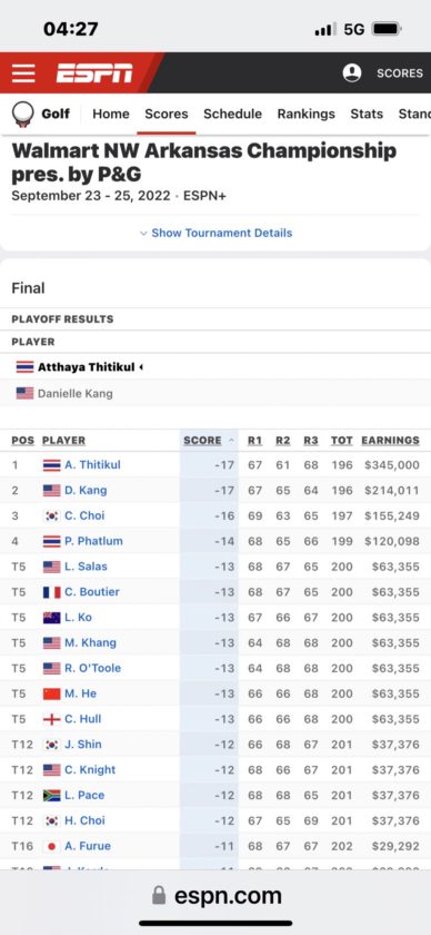 “โปรจีน” อาฒยา ฐิติกุล วัย 19 ปีเล่นวันสุดท้ายทำสกอร์ 3 อันเดอร์พาร์ 68 และ เดเนียล คัง โปรสาวชาวอเมริกันซึ่งทำ 7 อันเดอร์พาร์ 64 สกอร์รวมเท่ากันที่ 17 อันเดอร์พาร์ 196