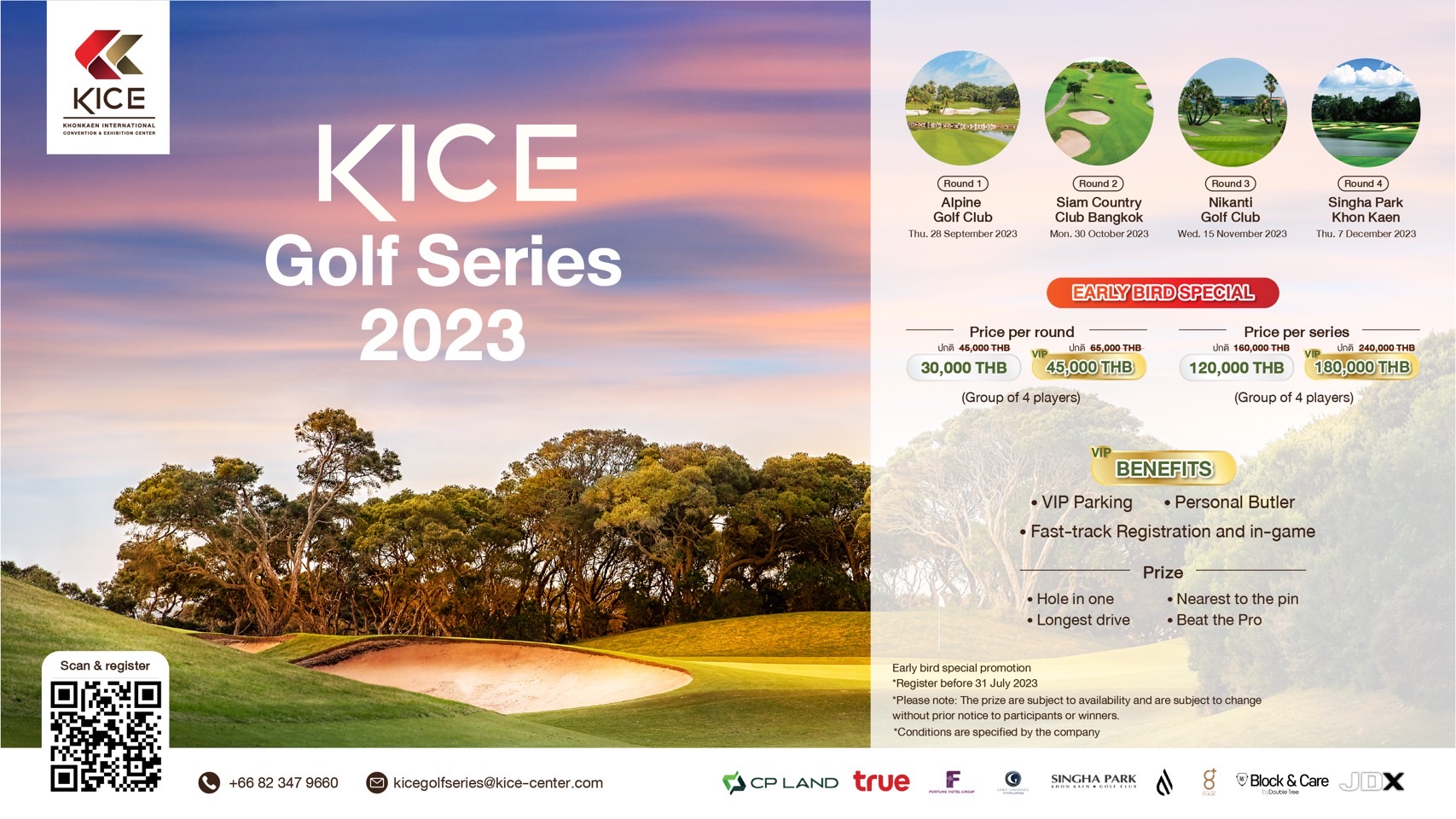 KICE (ไคซ์) – ศูนย์ประชุมและแสดงสินค้านานาชาติ ขอนแก่น ขอเชิญผู้ที่รักในกีฬากอล์ฟทุกท่าน เข้าร่วมดวลวงสวิง พร้อมเปิดโอกาสสร้างพันธมิตร และเครือข่ายทางธุรกิจ ภายใต้การแข่งขัน “KICE Golf Series 2023” ที่รวม 4 สนามชั้นนำ สุดเอ็กซ์คลูซีฟฃ โดยประเดิมสนามแรกที่ Alpine Golf Club ปทุมธานี ต่อเนื่องด้วย Siam Country Club กรุงเทพฯ ตามด้วย Nikanti Golf Club นครปฐม และปิดท้าย สนามสุดท้ายที่ Singha Park ขอนแก่น
