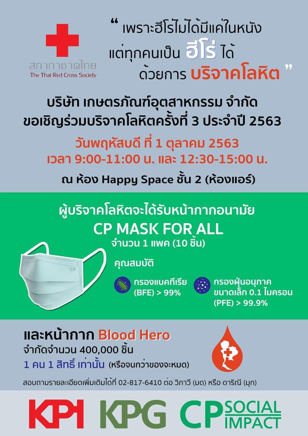 เมื่อวันที่ 1 ตุลาคม 2563 ที่ผ่านมา บริษัท เกษตรภัณฑ์อุตสาหกรรม จำกัด บริษัท เคพี กรีนเนอร์ยี จำกัด และบริษัท ซีพี โซเชียลอิมแพคท์ จำกัด ร่วมกับสภากาชาดไทย จัดกิจกรรมบริจาคโลหิต