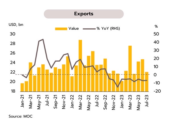 สะท้อนการส่งออกที่ยังอ่อนแอท่ามกลางการชะลอตัวของเศรษฐกิจโลก การดำเนินนโยบายการเงินเข้มงวดของประเทศแกนหลักซึ่งทำให้อุปสงค์มีแนวโน้มชะลอตัว อีกทั้งเศรษฐกิจจีนที่เป็นประเทศคู่ค้าสำคัญมีทิศทางฟื้นตัวช้าลงภายหลังแรงส่งจากการเปิดประเทศเริ่มแผ่วประกอบกับวิกฤตในภาคอสังหาริมทรัพย์ที่อาจบั่นทอนการใช้จ่าย