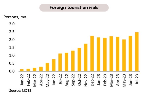 โดยภาคท่องเที่ยวยังมีแนวโน้มฟื้นตัวต่อเนื่องจำนวนนักท่องเที่ยวต่างชาติในเดือนกรกฏาคมแตะระดับ 2.49 ล้านคน สูงสุดนับตั้งแต่ประเทศไทยมีการเปิดประเทศหลังการระบาดโควิดผ่อนคลายลง โดยมีจำนวนนักท่องเที่ยวจีนสูงสุดเป็นอันดับหนึ่งได้เป็นเดือนแรกที่จำนวนกว่า 4 แสนคน รองลงมา ได้แก่ มาเลเซีย เกาหลีใต้ อินเดีย และเวียดนาม