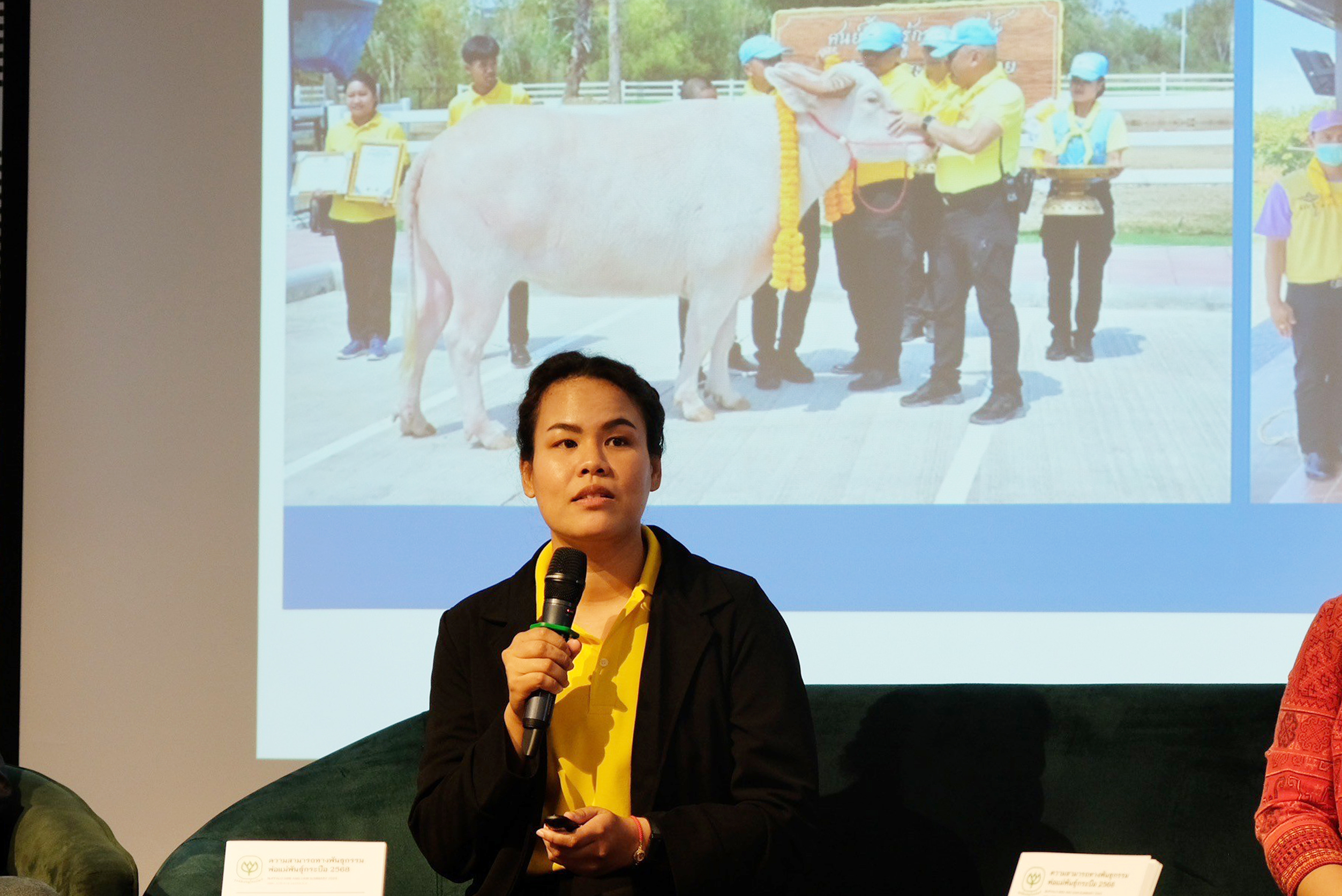 สพ.ญ.ธาราทิพย์ พุ่มระชัฎร์ นำเสนอรายละเอียดเกี่ยวกับโครงการพระราชทานจากพระบาทสมเด็จพระเจ้าอยู่หัวฯ ที่มีเป้าหมายเพื่ออนุรักษ์กระบือไทยให้คงอยู่และได้รับการพัฒนาต่อยอดอย่างเป็นระบบ นอกจากนี้ ยังได้เสนอแนวทางในการเพิ่มประสิทธิภาพการปรับปรุงพันธุ์ผ่านเทคโนโลยีชีวภาพ การขยายประชากรกระบือให้เหมาะสมกับทรัพยากรที่มีอยู่ เพื่อให้เกิดความสมดุลระหว่างการเลี้ยงเชิงอนุรักษ์และการพัฒนาเพื่อเศรษฐกิจ รวมถึงการจัดเก็บและใช้ประโยชน์จากข้อมูล การพัฒนาฐานข้อมูล และสร้างความเชื่อมโยงระหว่างข้อมูลด้านพันธุกรรมและการผลิต เพื่อสนับสนุนการตัดสินใจเชิงกลยุทธ์ในการบริหารจัดการกระบือไทยอย่างมีประสิทธิภาพ