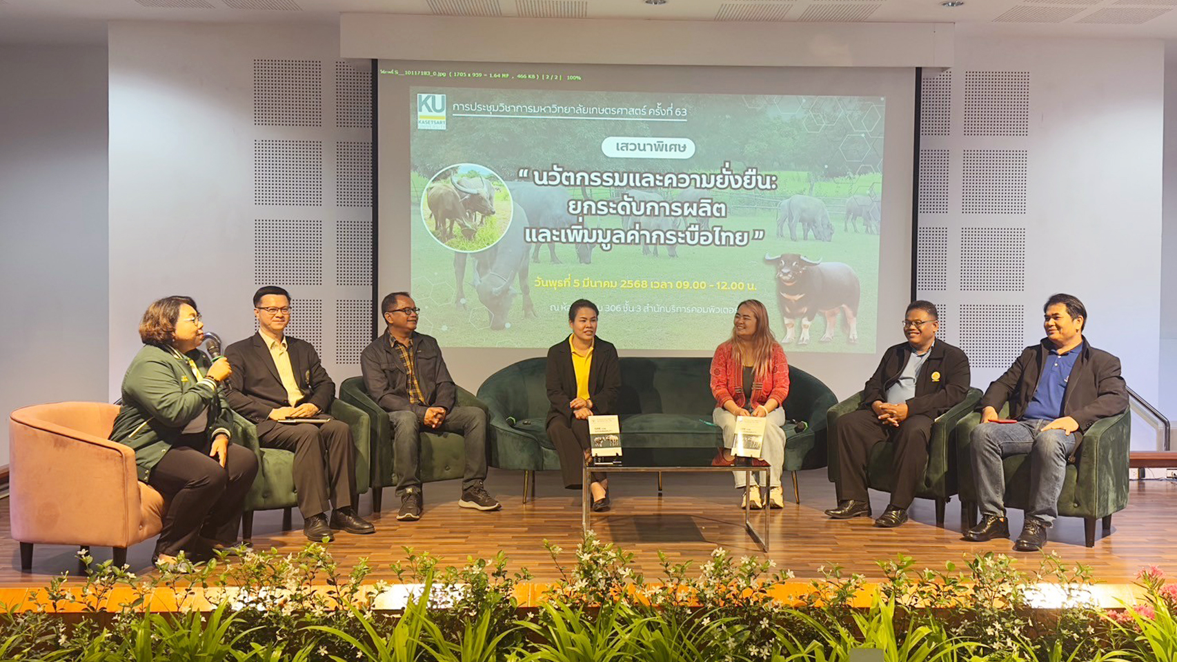5 มีนาคม 2568 มหาวิทยาลัยเกษตรศาสตร์ได้จัดการประชุมวิชาการ มหาวิทยาลัยเกษตรศาสตร์ ครั้งที่ 63 ระหว่างวันที่ 4-6 มีนาคม 2568 โดยมีแนวคิดหลักคือ “ปัญญาประดิษฐ์สู่การใช้ประโยชน์และการพัฒนาอย่างยั่งยืน” ซึ่งการประชุมครั้งนี้มุ่งเน้นการเชื่อมโยงระหว่างนวัตกรรมและความยั่งยืนในการพัฒนาทั้งในด้านวิชาการและการปฏิบัติจริง ในโอกาสนี้ ภาควิชาสัตวบาล คณะเกษตร มหาวิทยาลัยเกษตรศาสตร์ ได้จัดการเสวนาพิเศษในหัวข้อ “นวัตกรรมและความยั่งยืน : ยกระดับการผลิตและเพิ่มมูลค่ากระบือไทย” โดยมี รศ.ดร.ศกร คุณวุฒิฤทธิรณ จากหน่วยวิจัยเฉพาะทางพันธุศาสตร์สัตว์เขตร้อนชื้น ภาควิชาสัตวบาล คณะเกษตร มหาวิทยาลัยเกษตรศาสตร์ คุณสุพชัย ปัญญาเอก ผู้จัดการโครงการฟาร์มกระบือทันสมัย มูลนิธิเจริญโภคภัณฑ์ คุณจิราภัค ขำเอนก ประธานเครือข่ายผู้เลี้ยงกระบือจังหวัดบุรีรัมย์ และเจ้าของรวินันท์ฟาร์ม สพ.ญ.ธาราทิพย์ พุ่มระชัฎร์ จากโครงการอนุรักษ์และพัฒนากระบือไทย คุณนิรุจน์ พันธ์ศรี จากสำนักงานปศุสัตว์จังหวัดบุรีรัมย์ กรมปศุสัตว์ รวมทั้ง คุณสานน กันรัมย์ ผู้จัดการบริษัท สไมล์ บีฟ จำกัด ร่วมเป็นวิทยากรบนเวทีเสวนา ซึ่งดำเนินรายการโดย คุณธัญวรรณ ศรีวาจนะ จากสถานีวิทยุ มหาวิทยาลัยเกษตรศาสตร์ โดยมีการจัดขึ้นที่ ห้องประชุม 306 ชั้น 3 สำนักบริการคอมพิวเตอร์ มหาวิทยาลัยเกษตรศาสตร์