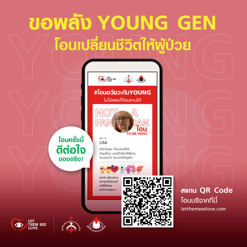 ขอพลังคนรุ่นใหม่ต่อชีวิตให้ผู้ป่วย โอนแสดงความจำนงบริจาคอวัยวะและดวงตา หรือโอนบริจาคสมทบทุนให้กระบวนการปลูกถ่ายอวัยวะและดวงตา สภากาชาดไทย ช่วยเหลือผู้ป่วยอวัยวะเสื่อมสภาพ แล้วร่วมกิจกรรม #โอนอวัยวะกันYOUNG แชร์บอกต่อ เพื่อต่อลมหายใจผู้ป่วย บริจาคเลย! ที่นี่ www.letthemseelove.com