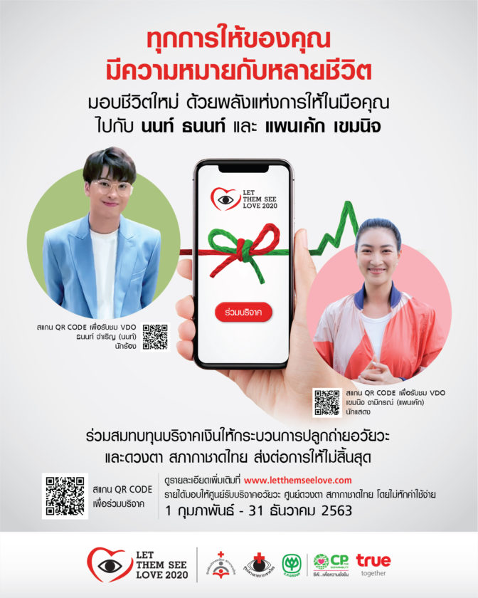 ‘‘นนท์ ธนนท์’’ และ ‘‘แพนเค้ก เขมนิจ’’ ขอเชิญชวนเพื่อนพนักงานร่วมทำความดีครั้งยิ่งใหญ่ ด้วยการบริจาคเงินให้ โครงการ Let Them See Love สมทบทุนการจัดซื้ออุปกรณ์การแพทย์ในกระบวนการปลูกถ่ายอวัยวะและดวงตา กับสภากาชาดไทยอบชีวิตให้ผู้ป่วยอวัยวะเสื่อมสภาพ ทุกการให้ของคุณมีความหมายกับหลายชีวิต