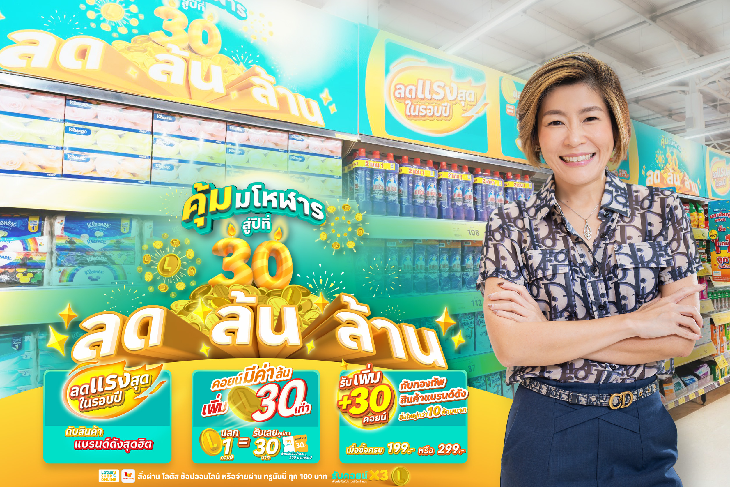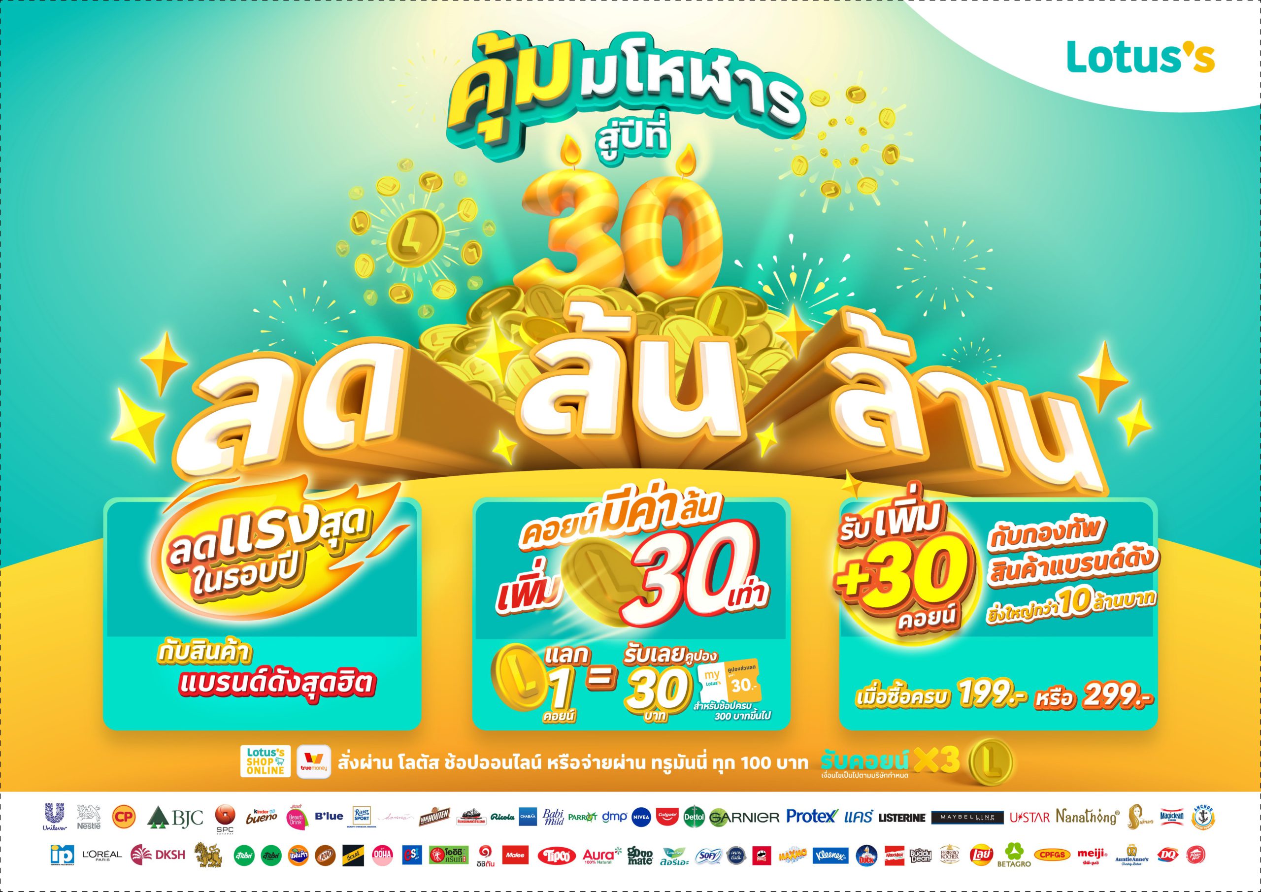 ในโอกาสที่โลตัสกำลังจะก้าวเข้าสู่ปีที่ 30 โลตัสจัดแคมเปญเฉลิมฉลองอย่างยิ่งใหญ่ร่วมกับพันธมิตรกว่า 100 แบรนด์ดัง ในแคมเปญโลตัส คุ้มมโหฬาร สู่ที่ปี 30 ลด ล้น ล้าน โดยมอบความคุ้มให้ลูกค้าถึง 3 ต่อ ได้แก่ “ลด” จัดทัพสินค้าลดราคาแรงที่สุดในรอบปี ทั้งของกิน-ของใช้ส่วนตัว-ของใช้ในบ้าน-เครื่องใช้ไฟฟ้า “ล้น” โลตัสคอยน์มีค่าล้น 30 เท่า โดย 1 โลตัสคอยน์ แลกรับส่วนลด 30 บาท ทั้งในส่วนของห้างและร้านค้า “ล้าน” รับเพิ่ม 30 โลตัสคอยน์ เมื่อซื้อครบ 299 หรือ 199 บาท กับกองทัพสินค้า