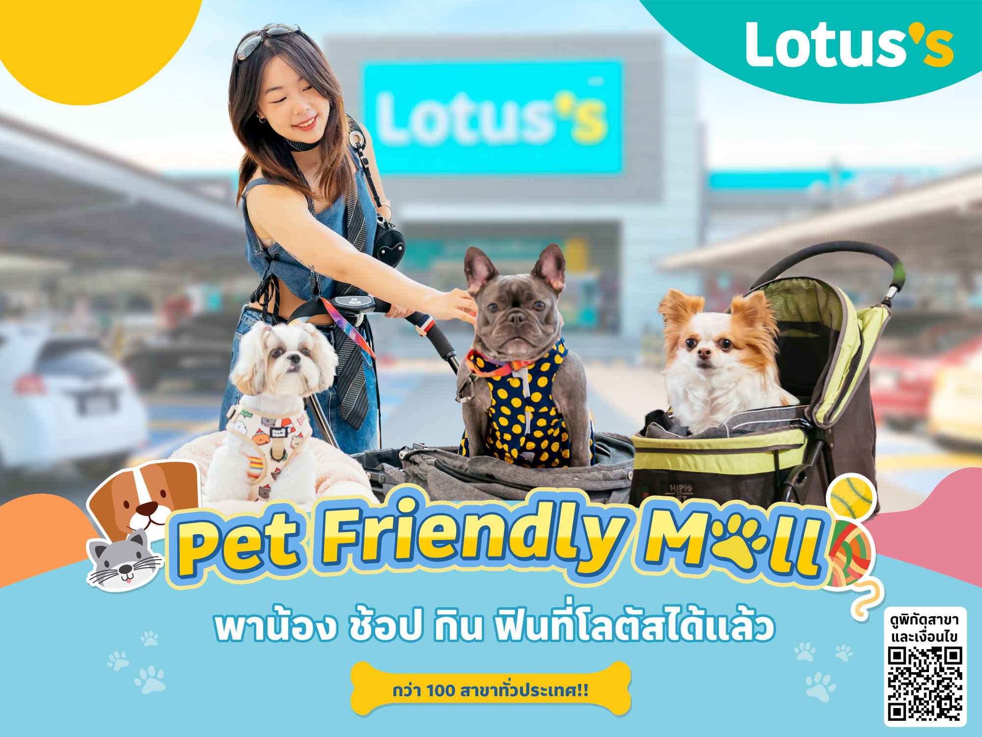 คุณเบญจวรรณ อ่องศรี ผู้อำนวยการอาวุโส สายงานบริหารพื้นที่ศูนย์การค้า โลตัส กล่าวว่า “โลตัส เดินหน้าในการเป็น SMART Community Center ศูนย์รวมการใช้ชีวิตแบบสมาร์ทของทุกคนในชุมชน โดยพัฒนาสาขารูปแบบใหม่ ปรับรูปโฉม ขยายพื้นที่ศูนย์การค้าในสาขาเดิม เพื่อให้แต่ละสาขามีพื้นที่การให้บริการที่ตอบโจทย์ไลฟ์สไตล์และความต้องการของคนในแต่ละพื้นที่มากขึ้น พร้อมจัดกิจกรรมพิเศษเพื่อตอบโจทย์การใช้ชีวิตของลูกค้า ในยุคปัจจุบันจะเห็นว่าคนเลี้ยงสัตว์กันมากขึ้น เกิดทาสน้องหมาน้องแมวมากมาย จนเป็นปรากฏการณ์ Pet Humanization จากพฤติกรรมที่เจ้าของสัตว์เลี้ยง ดูแลสัตว์เลี้ยงเสมือนว่าเป็นคนในครอบครัว เลี้ยงดูและให้ความรักไม่ต่างจากการเลี้ยงลูกเลี้ยงหลาน ซึ่งเป็นกระแสที่เป็นเมกะเทรนด์และมีแนวโน้มเติบโตทั่วโลกรวมทั้งในประเทศไทยด้วย โลตัสจึงพร้อมรองรับเทรนด์ดังกล่าวเพื่อตอบโจทย์ผู้บริโภคที่มีสัตว์เลี้ยง โดยเปิด Pet Friendly Mall นำร่องในโลตัส ไฮเปอร์มาร์เก็ต กว่า 100 สาขาทั่วประเทศ นับเป็นค้าปลีกแรกที่ปรับตัวรองรับครอบครัวสัตว์เลี้ยงในจำนวนสาขาที่เยอะที่สุดและครอบคลุมทั่วไทย อาทิ โลตัส นอร์ธ ราชพฤกษ์, โลตัส พัฒนาการ, โลตัส รามอินทรา, โลตัส เลียบคลองสอง, โลตัส ลาดกระบัง, โลตัส บางนา-ตราด, โลตัส เชียงใหม่ (คำเที่ยงและหางดง), โลตัส ชลบุรี, โลตัส จันทบุรี, โลตัส โคราช, โลตัส อุบลราชธานี, โลตัส สุราษฎร์ธานี, โลตัส ภูเก็ต และอีกมากมาย ที่เปิดพื้นที่ต้อนรับครอบครัวก๊วน 4 ขา ให้เจ้าของสามารถพาน้อง ๆ มาร่วมช้อปปิ้งที่โลตัสได้ในโซนศูนย์การค้า รวมทั้งร้านค้าร้านอาหารบางร้านที่มีความเหมาะสมและมีโซนที่สัตว์เลี้ยงสามารถเข้าได้ โดยมีเงื่อนไขการพาสัตว์เลี้ยงเข้าศูนย์การค้า เพื่อยังคงมาตรฐานด้านคุณภาพและการควบคุมเรื่องสุขอนามัย เพื่อมอบความสุขทั้งครอบครัวที่มีสัตว์เลี้ยงและลูกค้าทั่วไป สร้างความรู้สึกดีดี ทุกวัน ที่โลตัส”