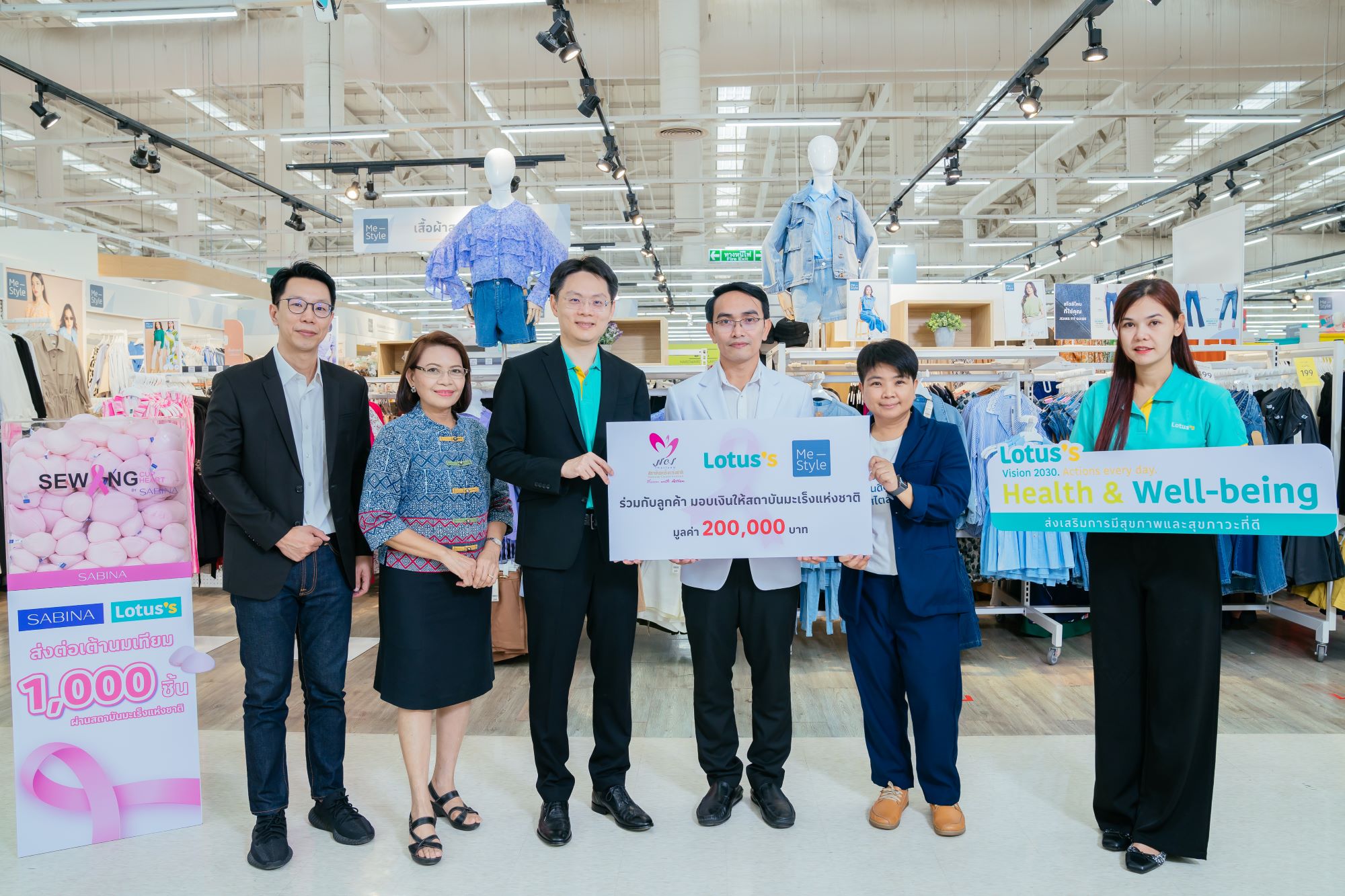 โลตัส โดย ดร.อภิรักษ์ เดชวรสิทธิ ผู้อำนวยการอาวุโส สายงานกลยุทธ์และสนับสนุนธุรกิจ โลตัส มอบเงินสนับสนุนมูลค่า 200,000 บาท ให้สถาบันมะเร็งแห่งชาติ โดย คุณโชคชัย สุขเหลือง รองผู้อำนวยการสถาบันมะเร็งแห่งชาติ เป็นผู้รับมอบ ซึ่งเป็นเงินบริจาคจากรายได้การจำหน่ายเสื้อผ้าและชุดชั้นในสตรี MeStyle (มีสไตล์) ภายใต้แบรนด์โลตัส ตลอดเดือนตุลาคมที่ผ่านมาที่เป็นเดือนแห่งการรณรงค์ป้องกันมะเร็งเต้านม เพื่อสนับสนุนการจัดซื้อเครื่องมือและอุปกรณ์ทางการแพทย์ ช่วยเหลือผู้ป่วยด้อยโอกาสต่อไป นอกจากนี้ โลตัสยังร่วมกับซาบีน่า ส่งมอบเต้านมเทียมจำนวน 1,000 ชิ้น เพื่อส่งกำลังใจและช่วยเหลือผู้ป่วยมะเร็งเต้านมอีกด้วย
