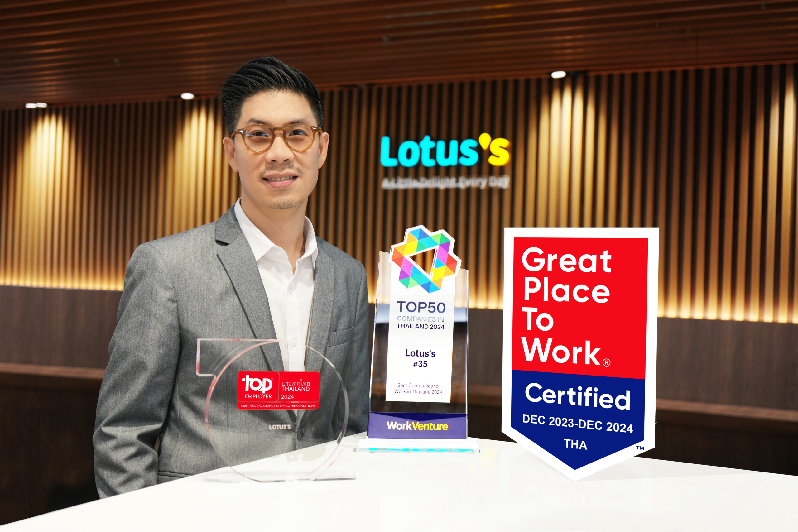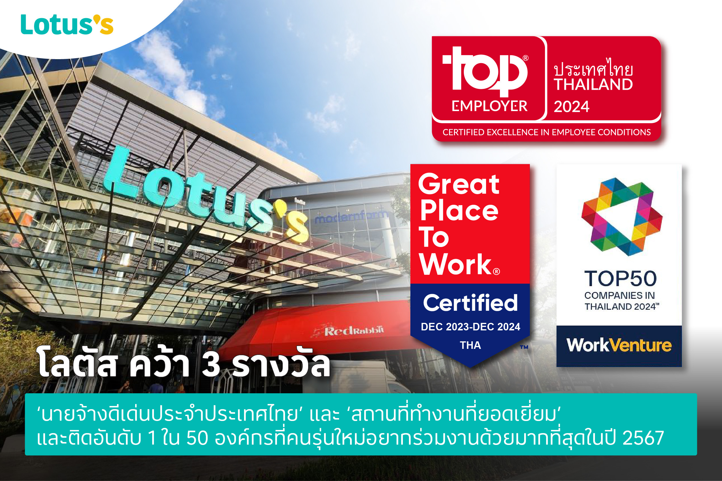 พร้อมยกระดับการดูแลพนักงานผ่านการให้ความสำคัญด้านการดูแลสุขภาพกาย สุขภาพใจ (Health & Well-Being) สร้างบรรยากาศและประสบการณ์ดี ๆ ในการทำงาน ซึ่งรางวัล Top Employers 2024 in Thailand นี้ ได้สะท้อนถึงความมุ่งมั่นของโลตัส ในการสร้างองค์กรที่เป็นสถานที่ทำงานเพื่อส่งเสริมชีวิตที่ดียิ่งขึ้นของเพื่อนพนักงาน และด้วยวัฒนธรรมองค์กรที่เราใส่ใจคุณค่าของพนักงานทุกคน จึงนำมาซึ่งผลสำรวจที่ได้รับคะแนนรวมจากเพื่อนพนักงาน 91% ที่ยอมรับให้ ’โลตัส เป็นสถานที่ทำงานที่ยอดเยี่ยม’ อีกทั้งเรายังส่งเสริมให้พนักงานปฏิบัติงานร่วมกันด้วยความเคารพทุกความแตกต่างและหลากหลายของเพื่อนพนักงานกว่า 55,000 คน ส่งผลให้เราได้รับคะแนนสำรวจด้านนี้ในเกณฑ์ที่สูงกว่ามาตรฐานสำหรับองค์กรใหญ่ในเชีย นอกจากนี้ โลตัส ยังสนับสนุนและเปิดกว้าง ให้พนักงานทุกคนกล้าคิด กล้านำเสนอไอเดีย นำไปสู่การสร้างสรรค์นวัตกรรมสิ่งใหม่ๆ ให้เกิดขึ้นในองค์กร อีกทั้งมีรูปแบบการทำงานที่ตรงใจคนรุ่นใหม่ ทำให้ปีนี้ โลตัสมีอันดับในโพลที่สูงขึ้นจากปีที่ผ่านมา ในอันดับที่ 35 จากผลสำรวจ 50 อันดับบริษัทในฝันที่คนรุ่นใหม่อยากร่วมงานด้วยมากที่สุดในปี 2024”