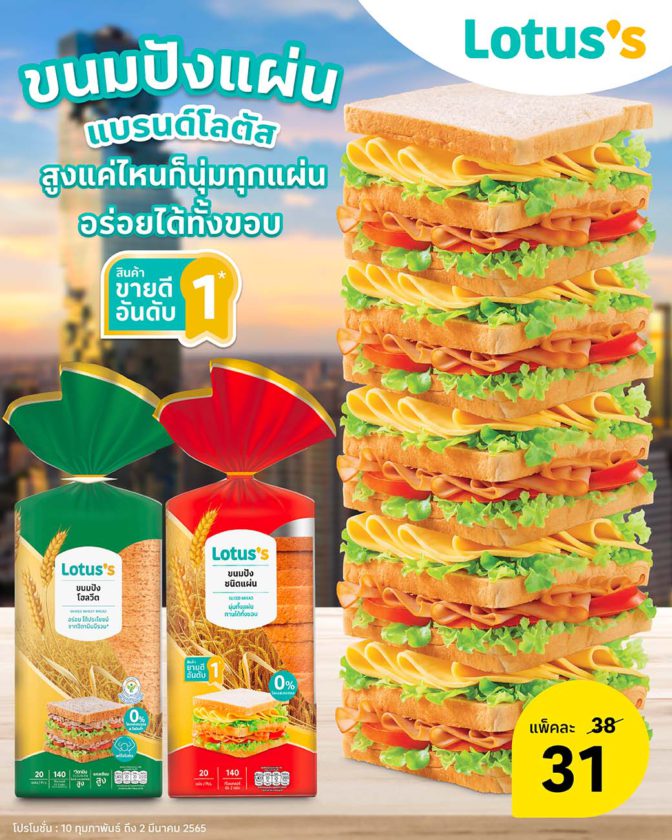 ขนมปังแผ่น และ ขนมปังโฮวีต แบรนด์โลตัส ปกติราคา 38 บาท ลดเหลือเพียง 31 บาทเท่านั้น