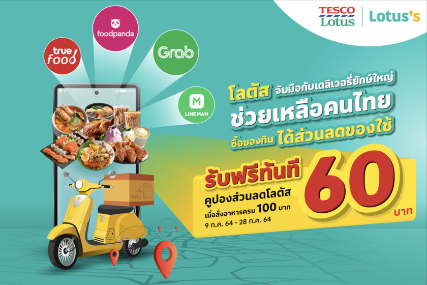 โลตัส จับมือ 4 เดลิเวอรี่แบรนด์ดัง ช่วยลูกค้าลดค่าใช้จ่ายฝ่าวิกฤติเศรษฐกิจโควิด-19 มอบคูปองส่วนลด อิเล็กทรอนิกส์ 60 บาท ในการช้อปปิ้งที่โลตัส เมื่อสั่งอาหารครบ 100 บาทขึ้นไปผ่าน 4 เดลิเวอรี่แอปพลิเคชัน แกร๊บฟู้ด ฟู้ดแพนด้า ไลน์แมน และทรูฟู้ด ตั้งแต่วันที่ 9 กรกฎาคม ถึง 28 กรกฎาคม 2564 โดยคูปองส่วนลดจะแบ่งเป็น 2 ส่วน ส่วนแรกคือ คูปองส่วนลด 30 บาท สำหรับการช้อปขั้นต่ำ 400 บาท ที่โลตัสทุกสาขา และส่วนที่สองคือ คูปองส่วนลด 30 บาท สำหรับการช้อปขั้นต่ำ 100 บาท ที่ร้านค้าเช่าที่ร่วมรายการภายในศูนย์การค้าของโลตัส