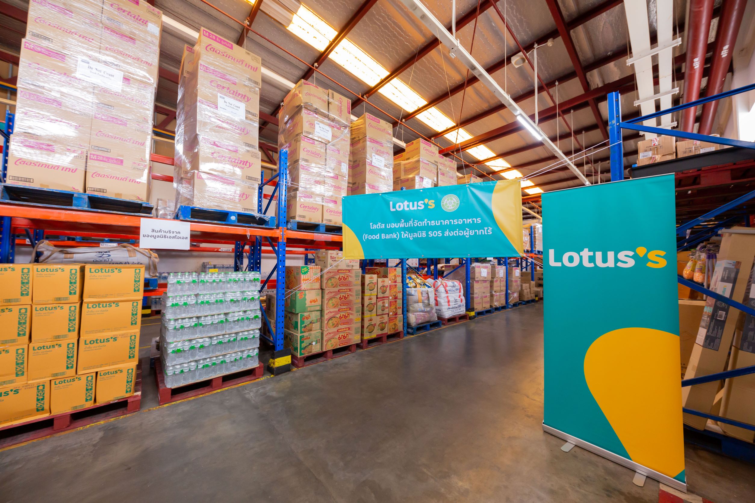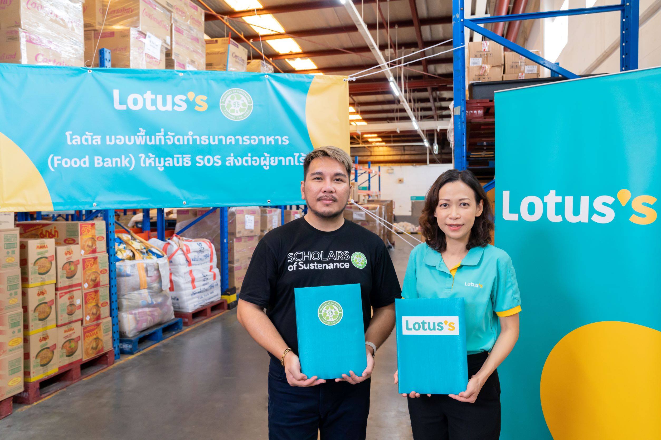 โลตัส ร่วมมือกับ มูลนิธิสโกลารส์ ออฟ ซัสทีแนนซ์ ประเทศไทย (SOS ประเทศไทย) ต่อยอดโครงการกินได้ไม่ทิ้งกัน ลงนามบันทึกข้อตกลงความร่วมมือขับเคลื่อนการก่อตั้งธนาคารอาหารแห่งชาติเพื่อผู้ด้อยโอกาส มอบพื้นที่ส่วนหนึ่งในสาขา โลตัส บ้านฟ้า ลำลูกกา ให้มูลนิธิ SOS ใช้เป็นโกดังจัดเก็บและกระจายอาหารที่ได้รับบริจาคเพื่อส่งต่อชุมชนขาดแคลน ผู้ยากไร้และผู้ด้อยโอกาส เพิ่มประสิทธิภาพในการบริหารจัดการอาหารให้รับบริจาคได้ในปริมาณมากขึ้น จัดเก็บในสถานที่ที่เหมาะสม ทำให้สามารถยืดอายุและรักษาคุณภาพอาหารได้ยาวนานขึ้น คงคุณค่าทางโภชนาการ ส่งต่อถึงมือผู้ที่ต้องการอย่างได้ประโยชน์สูงสุด พร้อมเดินหน้าขยายผลโครงการกินได้ไม่ทิ้งกัน เพิ่มพื้นที่บริจาคอาหารที่จำหน่ายไม่หมดแต่ยังรับประทานได้ให้ผู้ยากไร้ผ่านมูลนิธิ SOS ช่วยเหลือชุมชนและลดขยะอาหารให้เป็นศูนย์