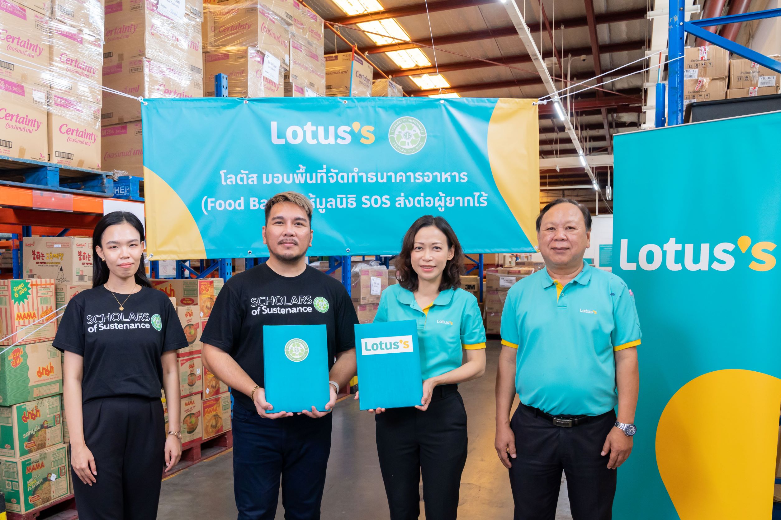 คุณเจมส์ เลย์สัน กรรมการผู้จัดการ มูลนิธิสโกลารส์ ออฟ ซัสทีแนนซ์ ประเทศไทย (มูลนิธิเอสโอเอส) กล่าวว่า “มูลนิธิ SOS บริหารจัดการอาหารส่วนเกินผ่านโครงการรักษ์อาหาร โดยทำหน้าที่เป็นตัวกลางในการรับบริจาคอาหารและกระจายอาหารส่วนเกินจากภาคการผลิตและภาคธุรกิจที่จำหน่ายไม่หมดแต่ยังคงรับประทานได้ ส่งต่อให้กับผู้ที่ต้องการความช่วยเหลือ เพื่อสร้างความมั่นคงทางอาหารและช่วยลดปริมาณขยะอาหารในประเทศไม่ให้ถูกทิ้งออกไปสู่สิ่งแวดล้อม การร่วมมือกับโลตัสในครั้งนี้จะช่วยให้มูลนิธิ SOS สามารถยกระดับการปฏิบัติภารกิจของเราไปสู่การเป็นธนาคารอาหารแห่งชาติ ขยายการช่วยเหลือผู้ด้อยโอกาสที่อยู่ในพื้นที่ห่างไกล เพิ่มประสิทธิภาพในการบริหารจัดการอาหาร มีจุดพักรอกระจายอาหารด้วยกระบวนการจัดเก็บที่ได้มาตรฐาน มีการควบคุมอุณหภูมิ ทำให้การเก็บอาหารปลอดภัยและถูกสุขลักษณะมากยิ่งขึ้น ช่วยให้ระบบการขนส่งโลจิสติกส์ของมูลนิธิ SOS ไร้รอยต่อยิ่งขึ้น สามารถส่งอาหารไปให้ผู้ที่ต้องการอาหารที่อยู่ห่างไกลขึ้นได้ ลดการเดินทางของอาหาร ลด carbon footprint เพื่อสิ่งแวดล้อมที่ยั่งยืน”