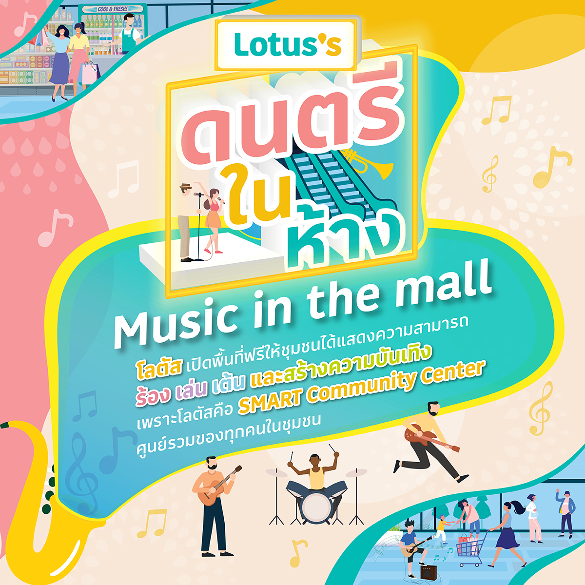 โลตัส ร่วมวงจัดกิจกรรม “ดนตรีในห้าง” เตรียมเปิดพื้นที่ในสาขาใหญ่ทั่วประเทศกว่า 200 สาขา ให้เป็นพื้นที่ของชุมชน เพื่อชุมชน เชิญชวนนักร้อง นักดนตรี วงดนตรีท้องถิ่น ใช้เวทีแสดงความสามารถและสร้างความบันเทิงให้คนในชุมชน นำร่องโดยการจัดมินิคอนเสิร์ต นำศิลปินชื่อดังและศิลปินหน้าใหม่ รวมทั้งเยาวชนที่เป็นวงนักเรียนนักศึกษา ประเดิมด้วยเอิ๊ต ภัทรวี, Ter Ter, Di6cover, Rouse, Good Mood, Fields มาร่วมมอบความสุขแบบจัดเต็มเปิดเวทีแห่งโอกาส ที่โลตัส สาขาพระราม 4 และไลฟ์ถ่ายทอดสดบรรยากาศความสนุกแบบเรียลไทม์ผ่านเฟซบุ๊กเพจโลตัส พร้อมกิจกรรมร่วมสนุกแจกของรางวัลมากมาย ในวันที่ 8 – 10 กรกฎาคม ที่ผ่านมา ตอกย้ำการเป็น SMART Community Center ศูนย์รวมการใช้ชีวิตในแบบสมาร์ทของทุกคนในชุมชน ผู้ที่สนใจสามารถติดต่อสอบถามได้ที่จุดบริการลูกค้าภายในสาขา ตั้งแต่วันที่ 15 กรกฎาคม 2565 เป็นต้นไป