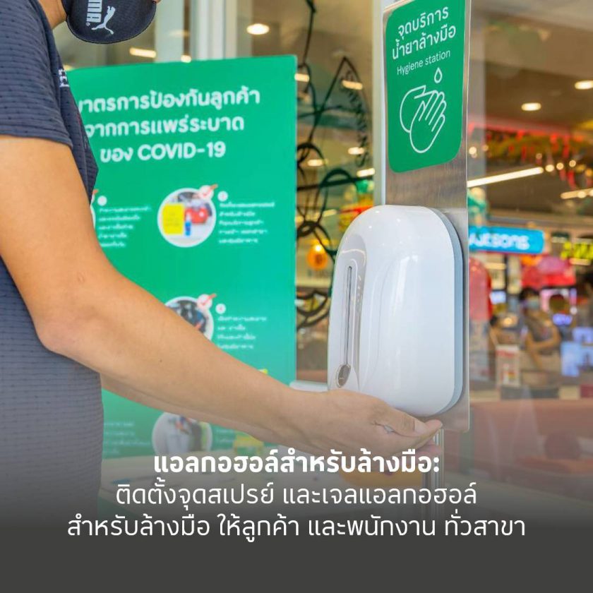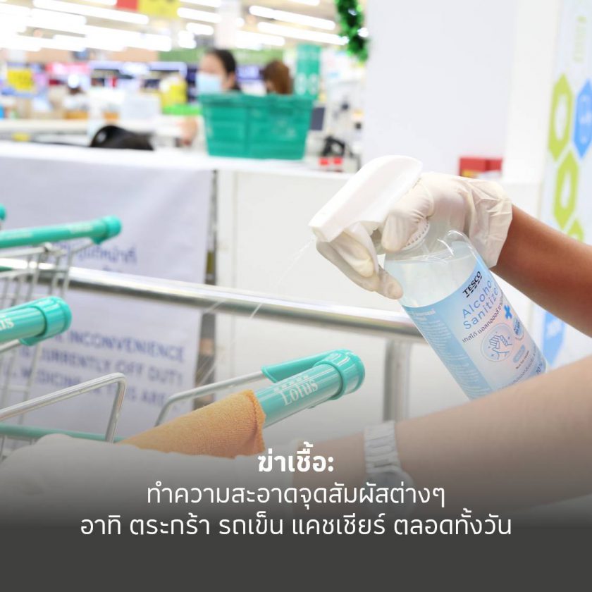 ✅ ทำความสะอาดและฆ่าเชื้อพื้นผิวทุกบริเวณเป็นประจำ อาทิ รถเข็นและตะกร้าช้อปปิ้ง เคาน์เตอร์แคชเชียร์ ราวจับบันไดเลื่อน ปุ่มกดลิฟต์ บัตรศูนย์อาหาร รวมไปถึงห้องน้ำ อบละอองฆ่าเชื้อทุกบริเวณสำหรับสาขาในบางพื้นที่