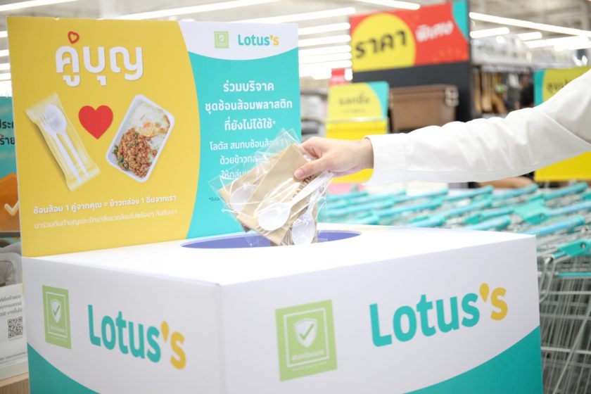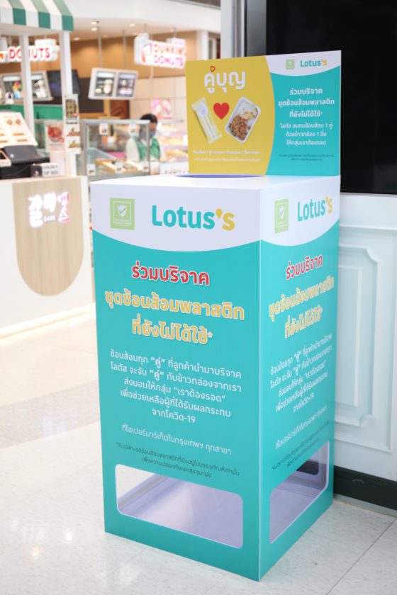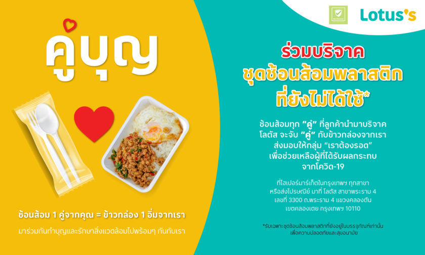 โลตัส ผุดแคมเปญ “คู่บุญ” เชิญชวนลูกค้าบริจาคช้อนส้อมพลาสติกที่ยังไม่ได้ใช้และยังอยู่ในบรรจุภัณฑ์ โดยโลตัสจะสมทบช้อนส้อมทุกหนึ่งคู่ ด้วยข้าวกล่องหนึ่งอิ่ม มอบให้กับกลุ่มเราต้องรอดและมูลนิธิดวงประทีป เพื่อนำไปมอบให้ชุมชนที่ได้รับผลกระทบจากโควิด-19 ทั้งผู้ที่ขาดรายได้ ศูนย์พักคอย และกลุ่มเปราะบาง โดยโลตัส ตั้งจุดรับบริจาคช้อนส้อมใน 46 ไฮเปอร์มาร์เก็ตทั่วประเทศ พร้อมเปิดจุดรับบริจาคส่วนกลางเพื่อให้ลูกค้าและประชาชนสามารถส่งช้อนส้อมผ่านไปรษณีย์