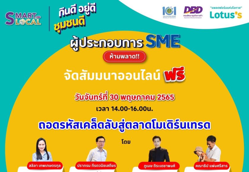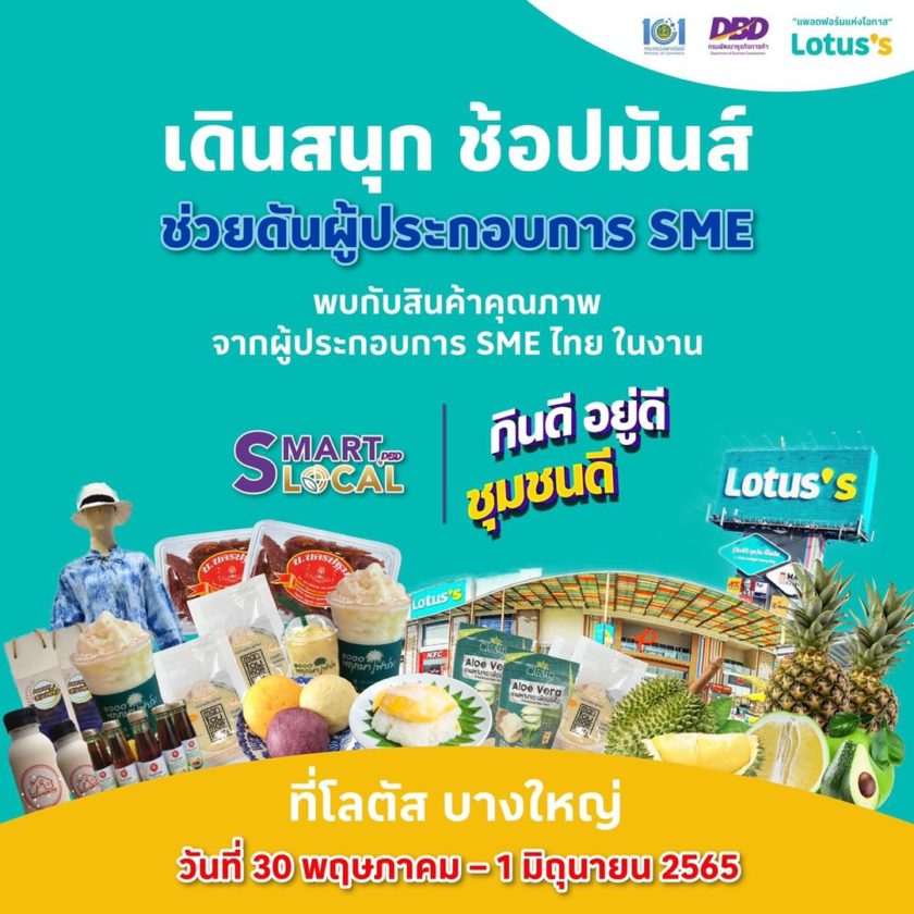 คุณทศพล ทังสุบุตร อธิบดีกรมพัฒนาธุรกิจการค้า กระทรวงพาณิชย์ เปิดเผยว่า กรมพัฒนาธุรกิจการค้าได้ร่วมกับ โลตัส จัด โครงการ “SMART Local กินดี อยู่ดี ชุมชนดี” ขึ้น ณ โลตัส สาขาบางใหญ่ จังหวัดนนทบุรี ระหว่างวันที่ 30 พฤษภาคม – 1 มิถุนายน 2565 กิจกรรมของโครงการ”SMART Local กินดี อยู่ดี ชุมชนดี” ประกอบด้วย