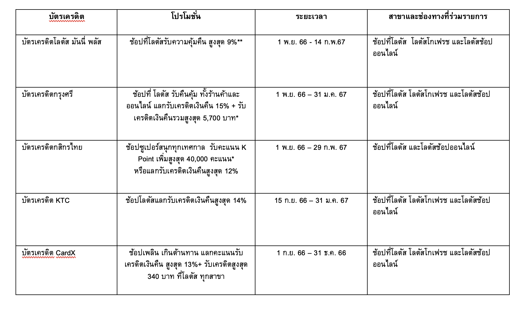 นางสาววรวรรณ เพียรลิขิตวงศ์ ผู้อำนวยการอาวุโส สายงานการตลาด โลตัส กล่าวว่า “ในช่วง โค้งสุดท้ายของปีนี้ คาดว่าประชาชนจะมีการจับจ่ายใช้สอยซื้อสินค้าอุปโภคบริโภคอย่างคึกคัก โลตัส พร้อมมอบความรู้สึกดีๆ แบบสุขใหญ่ เฉลิมฉลองเทศกาลส่งท้ายปี และจัดโปรโมชั่นพิเศษเพิ่มความคุ้มค่าให้ลูกค้าโลตัส โดยร่วมกับพันธมิตรบัตรเครดิตจากสถาบันการเงินชั้นนำ ทั้ง บัตรเครดิตโลตัส จากโลตัส มันนี่ พลัส บัตรเครดิตกรุงศรี บัตรเครดิตกสิกรไทย บัตรเครดิต KTC และบัตรเครดิต CardX โดยได้จัดโปรโมชั่นแบบสุขใหญ่ให้ลูกค้าช้อปสนุกฉลองเทศกาลปีใหม่ มอบความคุ้มค่าเฉพาะลูกค้าโลตัส ทั้งรับเครดิตเงินคืนมูลค่าสูงสุดกว่า 5,700 บาท หรือรับคะแนนสมาชิกบัตรเครดิตเพิ่มสูงสุด 40,000 คะแนน เมื่อช้อปผ่านสาขาของโลตัส โลตัสโกเฟรช หรือช้อปผ่านโลตัสออนไลน์ และ Lotus’s SMART App และชำระผ่านบัตรเครดิตที่ร่วมรายการตามที่กำหนด จึงขอเชิญชวนลูกค้าและประชาชนมาร่วมสัมผัสประสบการณ์ช้อปปิ้งสุดคุ้มที่โลตัสทั่วประเทศ นอกจากจะได้สินค้าคุณภาพดีในราคาที่คุ้มค่ายิ่งขึ้นแล้ว ยังได้ช้อปอย่างสนุกและเพลิดเพลินกับสินค้าปีใหม่ที่โลตัสคัดสรรมามากถึง 3,500 รายการ ฉลองเทศกาลส่งท้ายปี ให้ลูกค้า รู้สึกดีดี ทุกวัน ที่โลตัส”