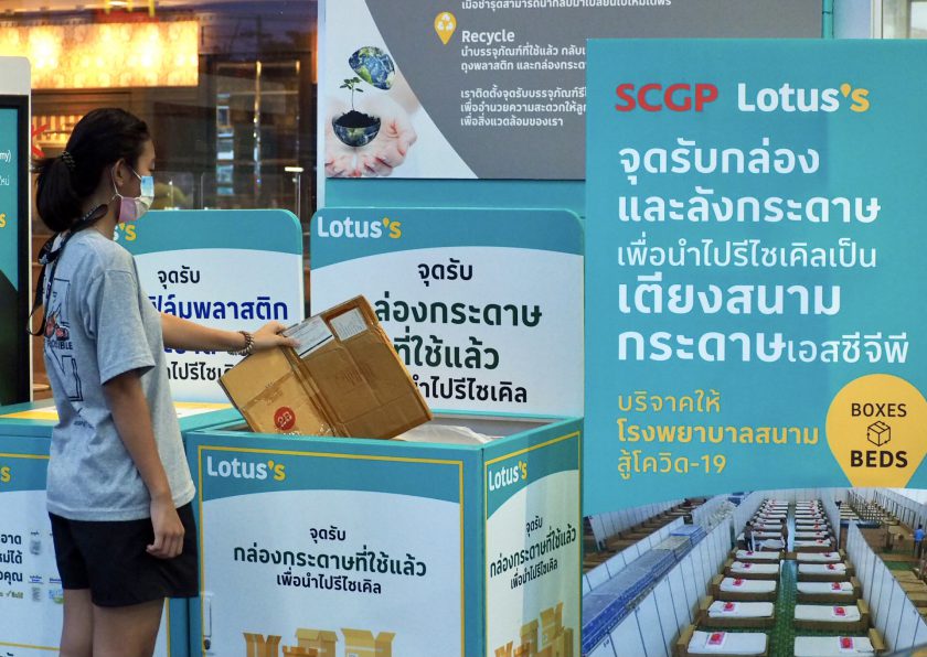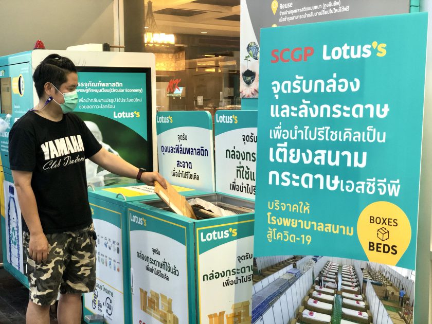 โลตัส ร่วมมือกับ SCGP เชิญชวนลูกค้าและประชาชนทั่วประเทศ ร่วมกันนำกล่องและลังกระดาษที่ไม่ใช้แล้ว มาบริจาคได้ที่จุดรับกล่องกระดาษในโลตัส ไฮเปอร์มาร์เก็ตทุกสาขาทั่วประเทศ เร่งผนึกกำลังนำกล่องที่ได้ไปรีไซเคิลเป็นเตียงสนามกระดาษเอสซีจีพี เพื่อกระจายให้กับโรงพยาบาลสนามทั่วประเทศ รองรับผู้ป่วยโควิด-19 ต่อไป