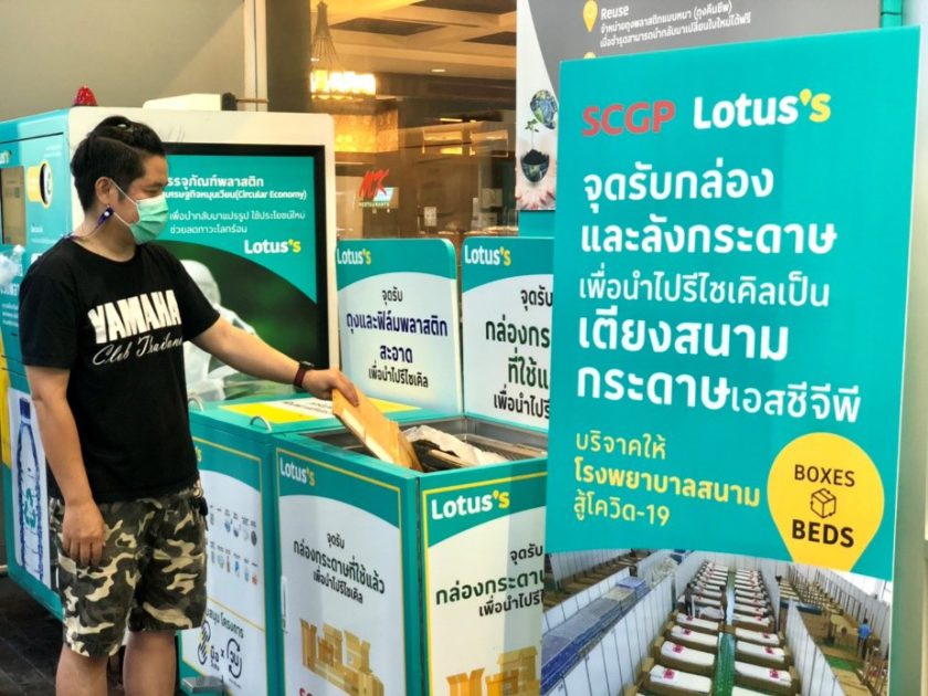- โครงการเปลี่ยนกล่องและลังกระดาษเป็นเตียงสนามกระดาษ SCGP โดยโลตัสจับมือกับ SCGP เปิดจุดรับกล่องและลังกระดาษจากลูกค้าและประชาชนทั่วประเทศที่โลตัส ไฮเปอร์มาร์เก็ตทุกสาขา เพื่อนำไปรีไซเคิลให้เป็นเตียงสนามกระดาษ เอสซีจีพี โดยระยะเวลาตั้งแต่การเปิดรับบริจาค โลตัสได้รับมอบกล่องและลังกระดาษไปแล้วกว่า 50,000 กิโลกรัม หรือนำไปรีไซเคิลเป็นเตียงสนามกระดาษได้จำนวนกว่า 3,500 เตียง ส่งกระจายให้กับโรงพยาบาลสนามเพื่อรองรับผู้ป่วยโควิด-19 เช่น โรงพยาบาลสนามอำเภอเพ็ญ จังหวัดอุดรธานี ขอเชิญชวนลูกค้าและประชาชน พับกล่องกระดาษ ทำความสะอาด ลอกเทปกาวออก และนำมาบริจาคได้เลยที่โลตัส ไฮเปอร์ มาร์เก็ต 220 สาขา ทั่วประเทศ