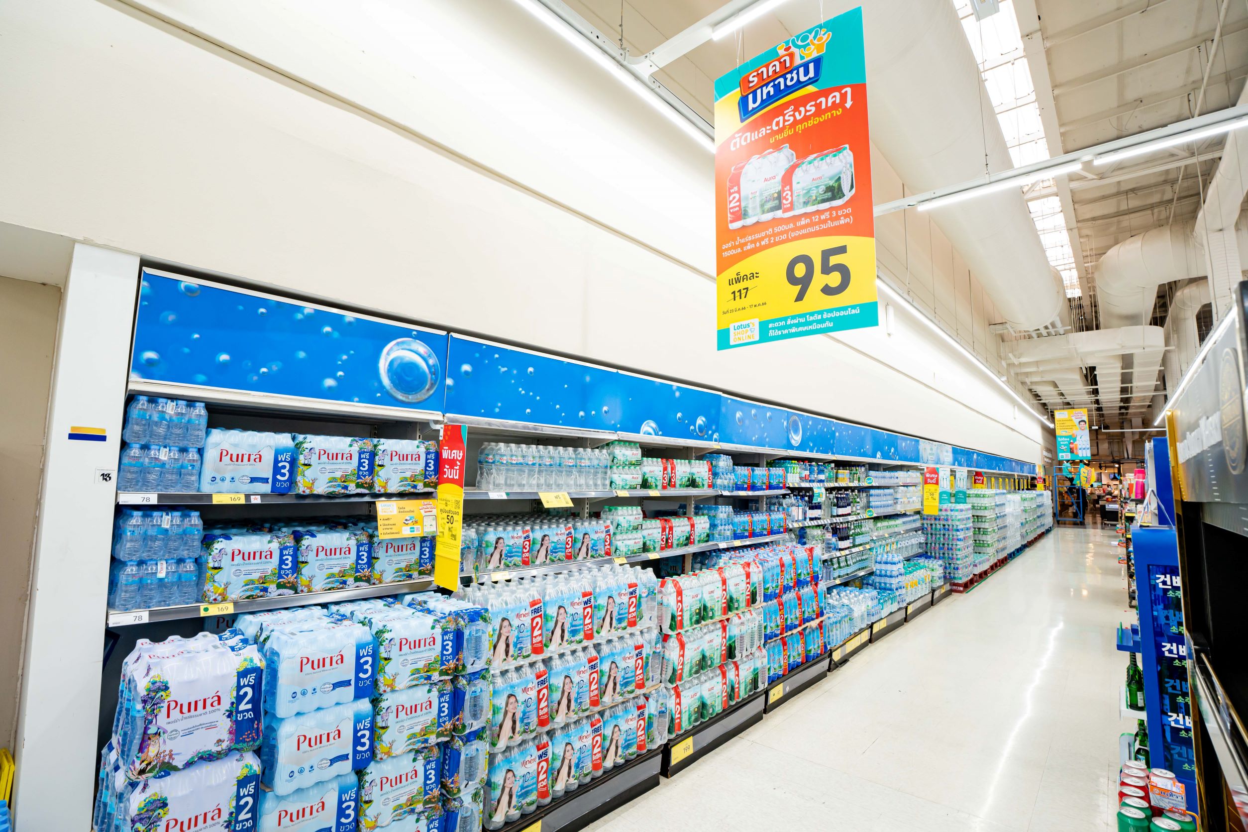 - ออร่า น้ำแร่ธรรมชาติ 100% 500 มล. แพ็ก 12 ขวด / 1,500 มล. แพ็ก 6 ขวด ราคาปกติ 117 บาท ราคามหาชน 95 บาท