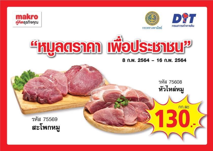 แม็คโครตระหนักถึงผลกระทบดังกล่าว จึงร่วมกับกรมการค้าภายใน กระทรวงพาณิชย์ จำหน่ายหมูเนื้อแดง (สะโพก, หัวไหล่หมู) ราคา 130 บาท เพื่อช่วยลดภาระค่าครองชีพประชาชนที่มีความต้องการใช้เนื้อสุกรในช่วงเทศกาลสำคัญ โดยตรึงราคาหมูเนื้อแดง ในราคากิโลกรัมละ 130 บาท ทุกสาขาทั่วประเทศไทยตั้งแต่วันที่ 8 – 16 กุมภาพันธ์ 2564”
