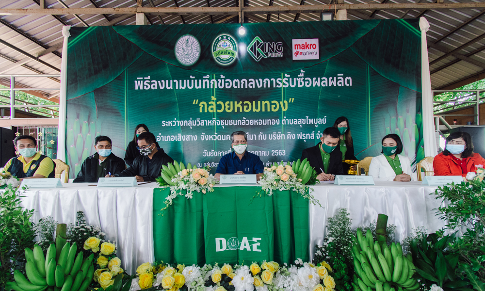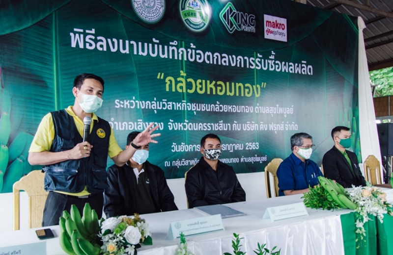 เมื่อวันที่ 14 กรกฎาคม 2563 สำนักงานเกษตรจังหวัดนครราชสีมา ได้จัดให้มีพิธีลงนามสัญญา ซื้อ-ขายกล้วยหอมทอง (MOU) ระหว่าง บริษัท คิง ฟรุทส์ จำกัด โดย คุณเกรียงศักดิ์ วิเลปะนะ ประธานกรรมการ บริษัท คิง ฟรุทส์ จำกัด คุณเสาวณี วิเลปะนะ กรรมการผู้จัดการ บริษัท คิง ฟรุทส์ จำกัด กับกลุ่มวิสาหกิจชุมชนกล้วยหอมทองตำบลสุขไพบูลย์ โดย คุณสมศักดิ์ แสงรัมย์ ประธานกลุ่มวิสาหกิจชุมชนปลูกกล้วยหอมทอง ต.สุขไพบูลย์ คุณสมศักดิ์ ทุมนอก กรรมการวิสาหกิจชุมชนฯ ณ ที่ทำการกลุ่มวิสาหกิจชุมชนกล้วยหอมทอง ตำบลสุขไพบูลย์ อำเภอเสิงสาง จังหวัดนครราชสีมา โดยมี คุณกังสดาล สวัสดิ์ชัย เกษตรจังหวัดนครราชสีมา เป็นประธานในพิธี และคุณจุฑารัตน์ พัฒนาทร ผู้อำนวยการฝ่ายประกันคุณภาพ บริษัท สยามแม็คโคร จำกัด (มหาชน) คุณสานิตย์ ศรีทวี นายอำเภอเสิงสาง ร่วมเป็นสักขีพยาน