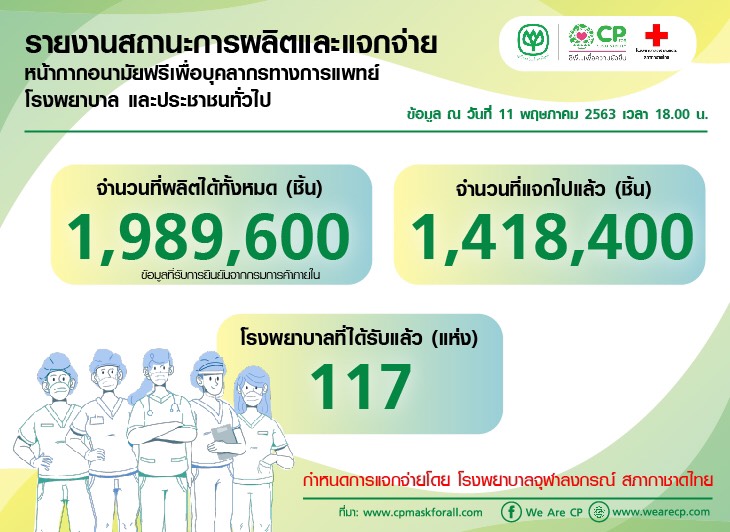 รายงานสถานะการผลิตและแจกจ่ายหน้ากากอนามัย ข้อมูล ณ วันที่ 11 พ.ค. เวลา 18.00 น. ยอดการผลิต 1,989,600 ชิ้น แจกจ่ายแล้ว 1,418,400 ชิ้น และ อยู่ระหว่างจัดส่งในหลายพื้นที่ อาทิ จ. นราธิวาส, สงขลา และ จ,ชลบุรี ฯลฯ จะมีการ อัพเดทยอดแจกจ่ายเมื่อส่งถึงมือผู้รับ 12 พฤษภาคม 256312 พฤษภาคม 2020SystemCP Mask ภารกิจนี้เพื่อชาติ, News สามารถอัพเดทความเคลื่อนไหวได้ที่ > www.cpmaskforall.com Post Views: 1,190
