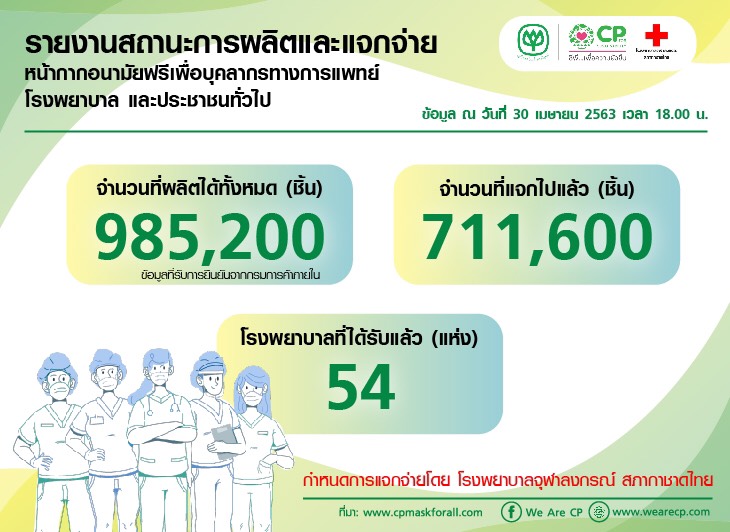 รายงานสถานะการผลิตและแจกจ่ายหน้ากากอนามัยฟรีเพื่อบุคลากรทางการแพทย์โรงพยาบาลและประชาชนทั่วไป / วันที่ 30 เม.ย. 63 1 พฤษภาคม 25632 พฤษภาคม 2020SystemNews สามารถอัพเดทความเคลื่อนไหวได้ที่ > www.cpmaskforall.com Post Views: 1,217