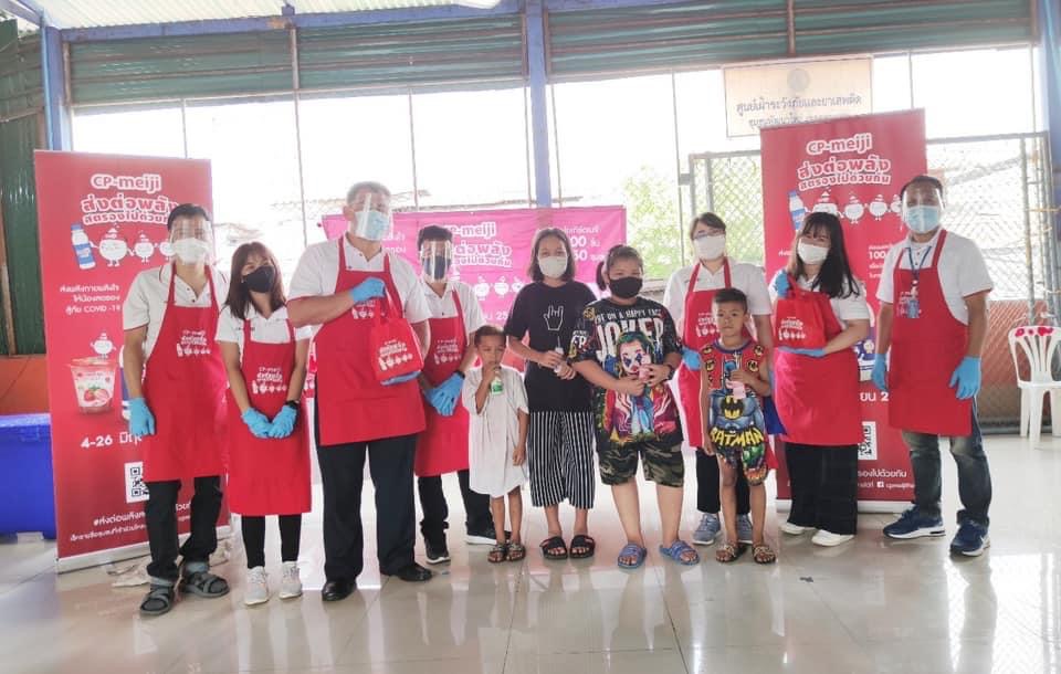 คุณสลิลรัตน์ พงษ์พานิช กรรมการผู้จัดการ พร้อมด้วย คุณทาคาฮิโร่ อาวาอิ รองกรรมการผู้จัดการอาวุโส นำผู้บริหารและพนักงาน ซีพี-เมจิ ร่วมแจกผลิตภัณฑ์นมและโยเกิร์ตเมจิคุณภาพ ในโครงการ “ส่งต่อพลัง สตรองไปด้วยกัน” ให้แก่เด็กและเยาวชนชุมชนพัฒนาใหม่ เขตคลองเตย มีสุขภาพดีแข็งแรงและพลังกายพลังใจสู้ภัย COVID-19 โดยมี คุณโศรยา วัธชนะ ผู้ช่วยผู้อำนวยการเขตคลองเตย และคุณมาเรียม ป้อมดี ประธานชุมชนพัฒนาใหม่ ร่วมรับมอบ ณ ชุมชนพัฒนาใหม่ (คั่วพริก) เขตคลองเตย