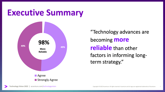 จากรายงาน Accenture ฉบับล่าสุด เก็บข้อมูลจากการสำรวจความคิดเห็นของผู้บริหารด้านธุรกิจและเทคโนโลยีกว่า 4,600 คนจาก 23 อุตสาหกรรม ใน 35 ประเทศ รวมถึงประเทศไทย ผลสำรวจชี้ให้เห็นว่าทั้งผู้บริหารไทย และผู้บริหารทั่วโลกมีความเห็นไปในทิศทางเดียวกันว่าเทคโนโลยีใหม่ๆ เป็นพลังขับเคลื่อนวิสัยทัศน์ขององค์กให้มีทางเลือกและโอกาสมากยิ่งขึ้น