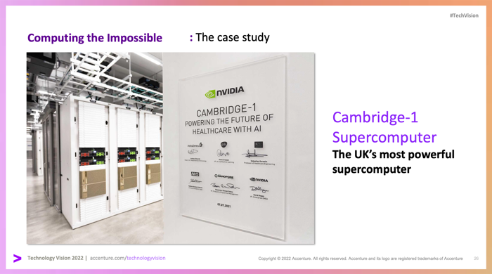 – Cambridge-1 เป็น Supercomputer อยู่ในอังกฤษ สร้างขึ้นโดยความร่วมมือระหว่าง NVDIA และพันธมิตร เช่น Astrazeneca, GSK, King’s College London มีวัตถุประสงค์เพื่อการวิจัยด้านสุขภาพและทางการแพทย์ รวมทั้งปลดล็อกความเข้าใจเชิงลึกของโรคและความก้าวหน้าทางแพทย์ของสหราชอาณาจักร