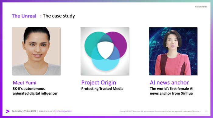 ธุรกิจและสภาพแวดล้อมต่างๆ จะทำงานด้วยข้อมูลจาก AI มากขึ้น สะท้อนให้เห็นโลกทางกายภาพได้อย่างเสมือนจริง ดังนั้น AI จึงมีความสำคัญมากที่สุดต่อธุรกิจยิ่งกว่าที่เคยเป็นมา เพราะทั้งองค์กรและผู้บริโภคมีมุมมองเปลี่ยนไป จากที่เคยเทียบของจริงกับของปลอม กลายเป็นการมองที่ความแท้ (authentic) ที่ไม่ใช่แค่ความแท้จากเนื้อหาและอัลกอริทึมขององค์กร แต่รวมถึงตัวแบรนด์ทั้งหมดด้วย เมื่อโลกไม่แท้จริงกลายมาเป็นโลกจริง จึงถึงเวลาที่ธุรกิจต่างๆ ต้องเตรียมธุรกิจของตนให้พร้อม