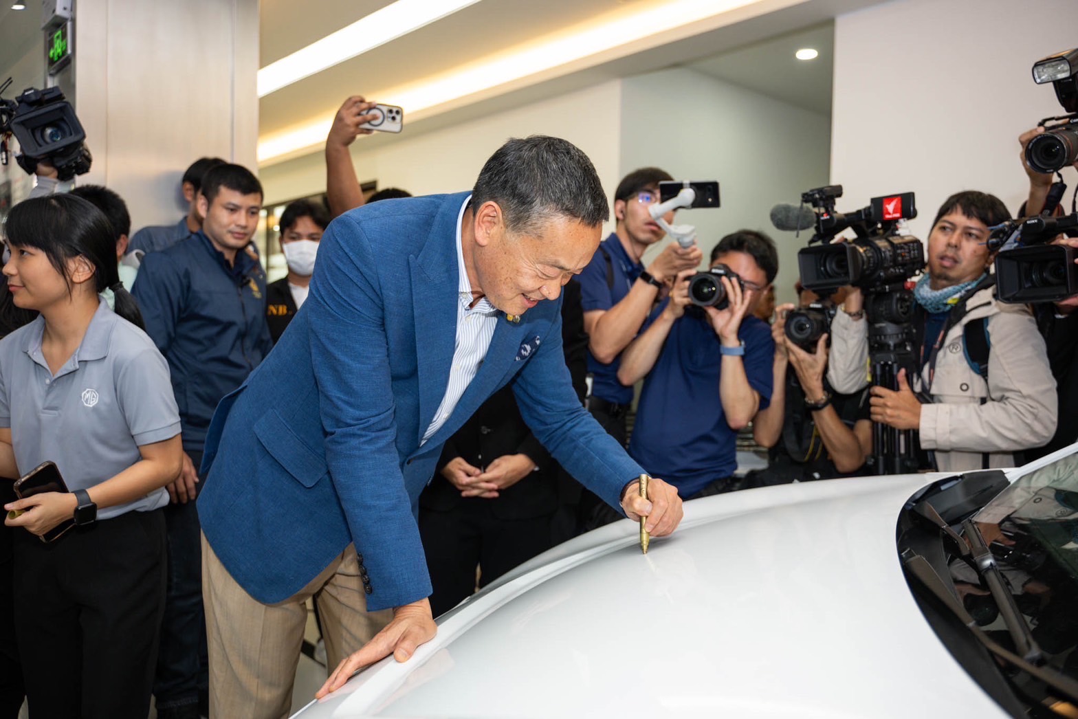 จากนั้น นายกรัฐมนตรี คุณธนากร เสรีบุรี และ คุณจรีพร จารุกรสกุล ได้ร่วมลงนามบนรถยนต์พลังงานไฟฟ้า NEW MG4 ELECTRIC Thailand Edition และบนแบตเตอรี่รถยนต์อีวี เพื่อเป็นที่ระลึก ซึ่งทั้งสองเป็นผลิตภัณฑ์ของเอ็มจีรุ่นแรกที่ประกอบในประเทศไทย