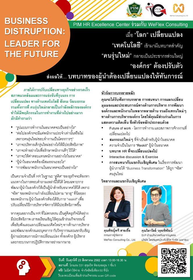 PIM HR Excellence Center ร่วมกับ WeFlex Consulting จัดสัมมนาเพื่อเเลกเปลี่ยนมุมมองและประสบการณ์ทางด้านการบริหาร การพัฒนาองค์กรและพนักงานในหลากหลายด้าน รวมถึงเทรนใหม่ๆ พร้อมทั้งWorkshop ในห้องสัมมนา จัดขึ้นในวันศุกร์ที่ 23 สิงหาคม 2562เวลา 13.00-16.30 น. ณ โรงแรม S31 สุขุมวิท