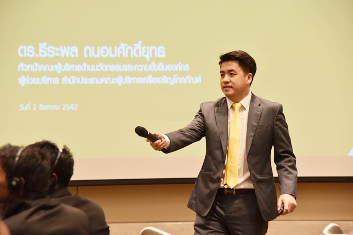 โดยหลักสูตรในวันนี้เริ่มด้วยกิจกรรมสนุกสนาน Morning Jiggles ให้ผู้ร่วมหลักสูตรทุกคนลุกขึ้นออกกำลังกาย ขยับร่างกายตามจังหวะเสียงเพลงก่อนเข้าเนื้อหาหลักสูตร ทั้งนี้ ดร.ธีระพล ได้ให้แง่คิดของการเป็นผู้นำในยุคของการสื่อสารดิจิตอลว่า “การสื่อสารที่ดีไม่ได้หมายถึงการพูดเพียงอย่างเดียว แต่การสื่อสารในยุคนี้รวมถึงภาษาภาย คือทุกอย่างที่เราได้แสดงออก แม้ว่าเราจะเป็นคนรุ่นใหม่ แต่ต้องไม่ลืมความเป็นตัวตน รักษาคุณค่า วัฒนธรรมและความเป็นองค์กรไว้ให้ได้ กระแสของสื่อในยุคปัจจุบันไม่ได้จะดีไปทั้งหมด เราต้องเป็นคนคัดกรอง เรื่องใหม่ๆที่ดีก็เก็บไว้ ส่วนเรื่องที่ไม่ดีก็ไม่ควรเอาเป็นแบบอย่าง จะเป็นผู้นำที่ดีในการสื่อสารยุคดิจิตอลได้ต้องก้าวข้าม S Curve และ Disruption ไปให้ได้”