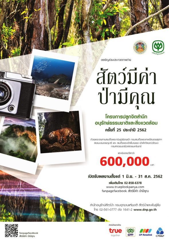 กรมอุทยานแห่งชาติสัตว์ป่าและพันธุ์พืช เครือเจริญโภคภัณฑ์ และกลุ่มทรู ขอเชิญทุกท่านร่วมเก็บความงดงามของธรรมชาติ และสัตว์ป่าในเมืองไทย ผ่านภาพถ่ายอันทรงคุณค่า เข้าร่วมประกวดในโครงการปลูกจิตสำนึกอนุรักษ์ธรรมชาติและสิ่งแวดล้อม การประกวดภาพถ่าย ‘สัตว์มีค่า ป่ามีคุณ’ประจำปี 2562 ครั้งที่ 25
