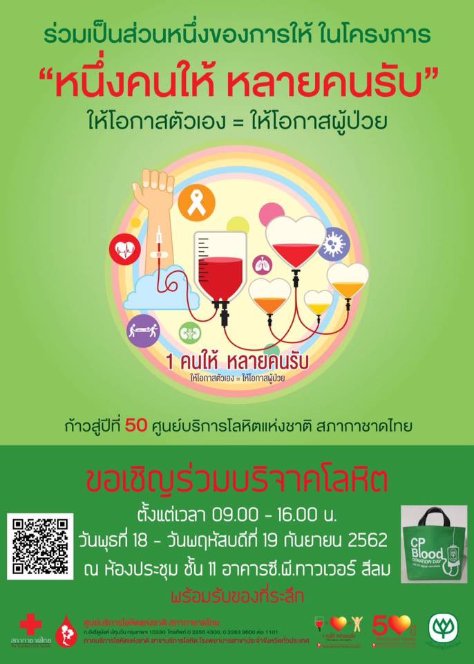 โดยศูนย์บริการโลหิตแห่งชาติ สภากาชาดไทย กำหนดมารับบริจาคโลหิต ครั้งที่ 3 ณ ห้องประชุม ชั้น 11 อาคารซี.พี.ทาวเวอร์ ถนนสีลม ในวันพุธที่ 18 และวันพฤหัสบดีที่ 19 กันยายน 2562 เวลา 8.30-16.00 น.ขอเชิญชวนผู้บริหาร พนักงานร่วมบิจาคโลหิตกัน