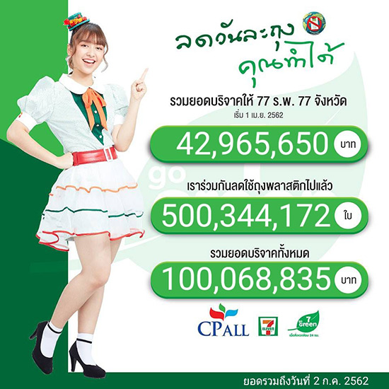 หรืออย่าง 7-eleven ภายใต้ บริษัท ซีพี ออลล์ จำกัด (มหาชน) ซึ่งประสบความสำเร็จอย่างมาก ในการดำเนินนโยบายลดเลิกการใช้พลาสติก จากโครงการ ‘ลดวันละถุง คุณทำได้’ ทีมีนักร้องขวัญใจมหาชน ตูน-อาทิวราห์ คงมาลัย เป็นพรีเซนเตอร์ ถือเป็นผลงานชิ้นโบว์แดงของบริษัทฯ ที่ส่งผลกระทบในทางบวก สร้างแรงกระเพื่อมในการปฏิเสธไม่รับถุงอย่างได้ผล ด้วยการ ‘เปลี่ยนถุงเป็นเงิน’ นั่นคือ เมื่อลูกค้าปฏิเสธการรับถุง 1 ครั้ง เซเว่นฯ จะเปลี่ยนเป็นเงินบริจาค 20 สตางค์ ซึ่งจะรวบรวมเพื่อสมทบทุนซื้ออุปกรณ์การแพทย์ มอบให้อาคารนวมินทรบพิตร ๘๔ พรรษา โรงพยาบาลศิริราช