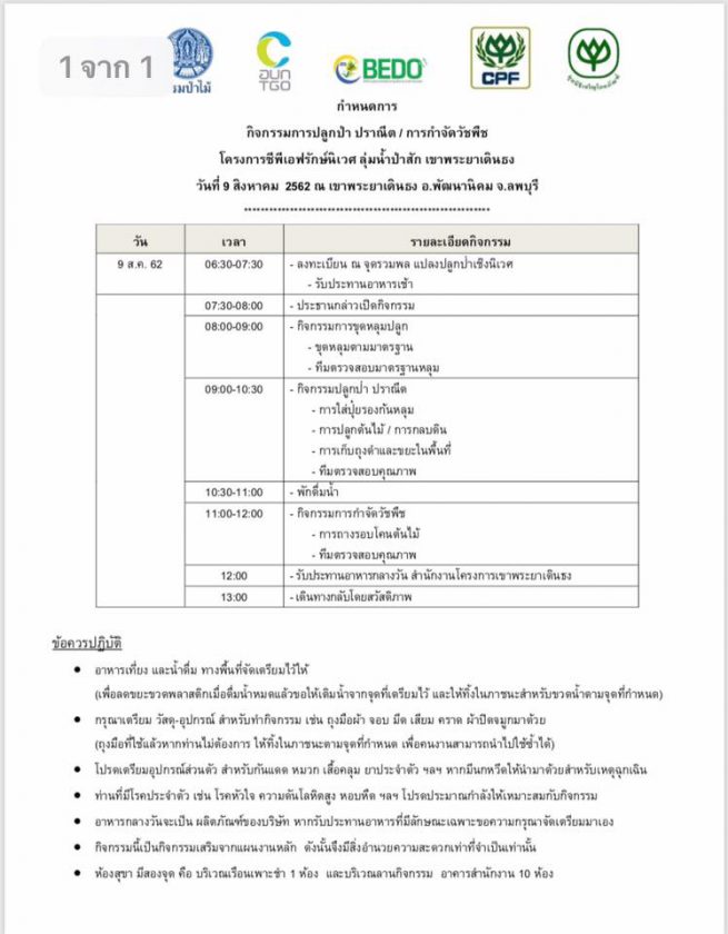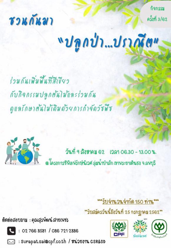 ยังคงมีกิจกรรมต่อเนื่องของโครงการซีพีเอฟรักษ์นิเวศน์ ลุ่มน้ำป่าสัก เขาพระยาเดินธงเตรียมจัดกิจกรรมดูแลผืนป่าครั้งที่3ประจำปี2562 โดยในวันที่ 9 สิงหาคมนี้ โครงการฯจะ จัดกิจกรรม”ปลูกป่า ปราณีต” ปลูกต้นไม้และกำจัดวัชพืช ชาวซีพีเอฟ ชาวซีพีสนใจร่วมเป็นจิตอาสากันค่ะ รับสมัครภายใน25ก.ค.นี้จ้า สอบถามเพิ่มเติมคุณสุรพัฒน์ สายเพชร 02 766 8581/086 721 2886