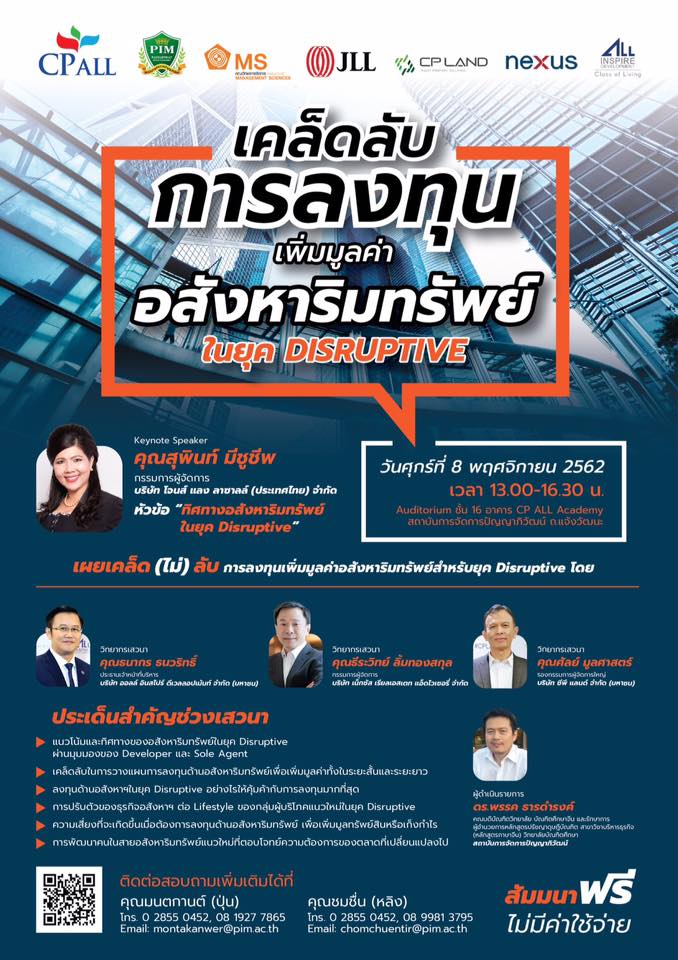 โดยได้รับเกียรติจากคุณสุพินท์ มีชูชีพ กรรมการผู้จัดการ บริษัท โจนส์ แลง ลาซาลล์ (ประเทศไทย) จำกัดผู้บริหารมืออาชีพและกูรูด้านอสังหาริมทรัพย์ทั้งในประเทศไทยและต่างประเทศ ร่วมแสดงวิสัยทัศน์ในประเด็น “ทิศทางและแนวทางการลงทุนอสังหาริมทรัพย์ในยุค Disruptive”