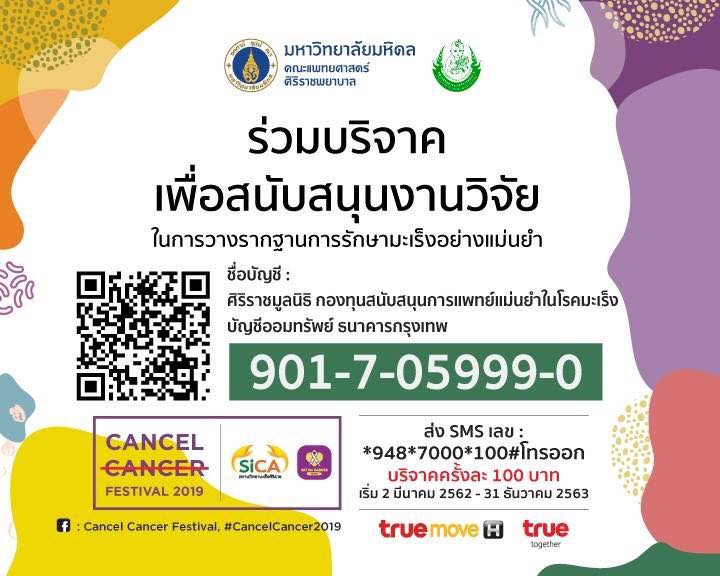 กลุ่มทรูเชิญชวนลูกค้า True Move H ร่วมบริจาค เพื่อสนับสนุนงานวิจัย การถอดรหัสยีนมะเร็งของคนไทย ให้ผู้ป่วยมีโอกาสหายจาก “มะเร็ง” มากขึ้น ร่วมบริจาค กด *948*7000*100# โทรออก บริจาคครั้งละ 100 บาท