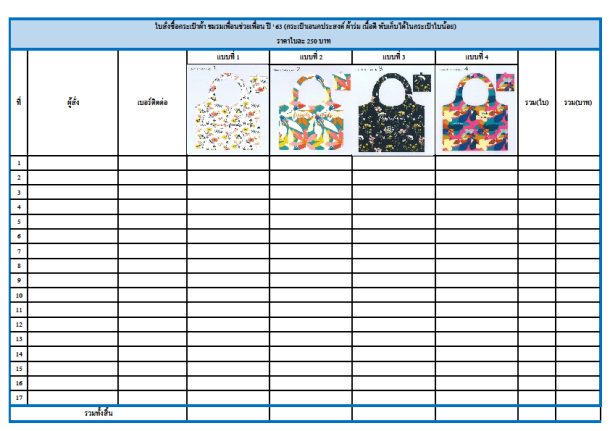 เนื่องในวาระวันขึ้นปีใหม่ 2563 ทางชมรมเพื่อนช่วยเพื่อนร่วมรณรงค์รักษ์โลก ดูแลสิ่งแวดล้อมลดการใช้ถุงพลาสติกตามนโยบายของเครือฯ จึงได้ผลิตถุงผ้าร่มพับใช้งานสะดวกสบาย โดยพิมพ์ลายที่ไม่เหมือนใครจำนวน 4 สี 4 แบบสีสันต์สดใส ราคาใบละ 250 บาท