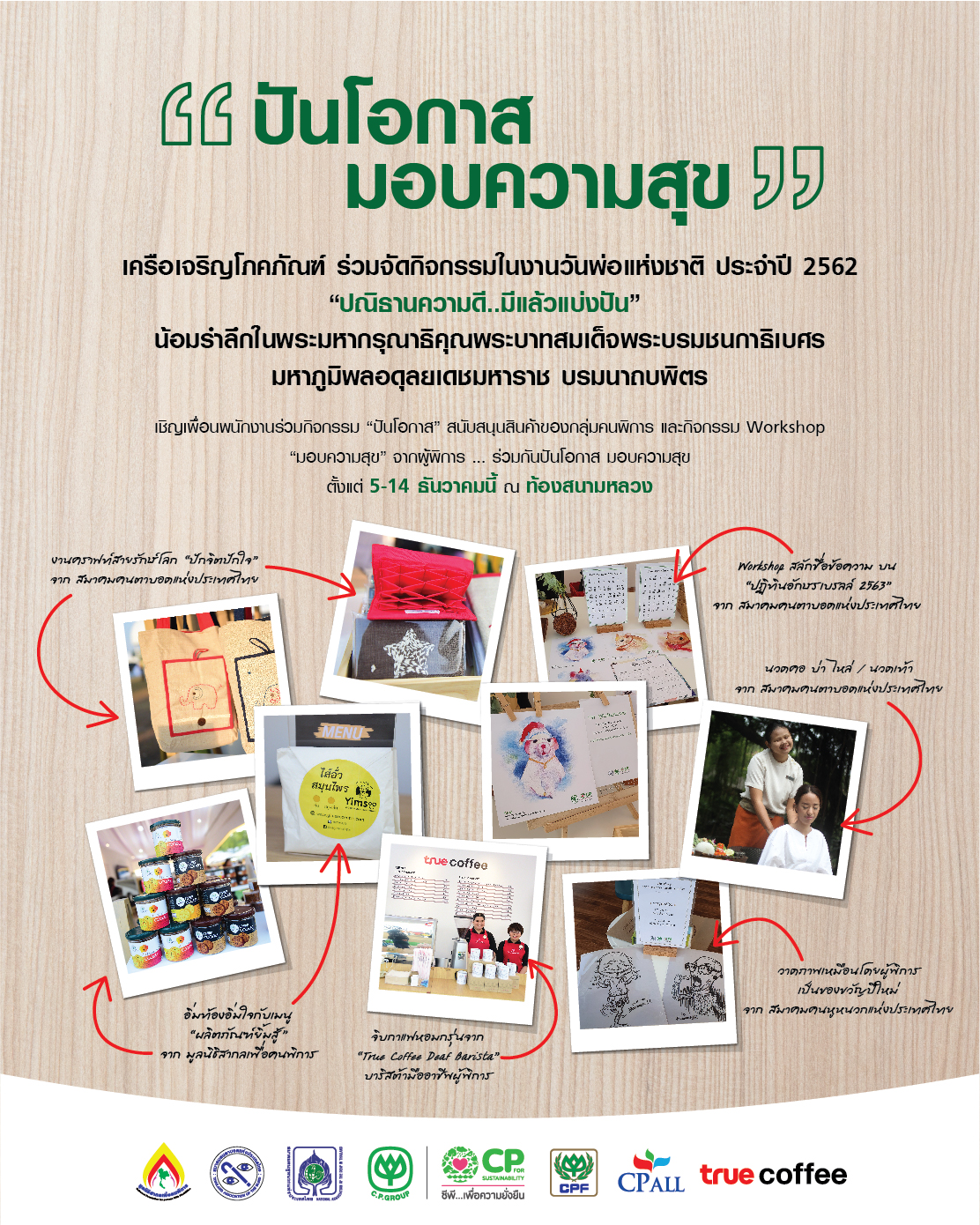 พลเอกประยุทธ์ จันทร์โอชา นายกรัฐมนตรี เป็นประธานเปิดนิทรรศการ “ปณิธานความดี..มีแล้วแบ่งปัน” ในงานวันพ่อแห่งชาติ ประจำปี 2562 ที่จัดขึ้นเพื่อแสดงออกซึ่งความจงรักภักดี และน้อมรำลึกในพระมหากรุณาธิคุณพระบาทสมเด็จพระบรมชนกาธิเบศร มหาภูมิพลอดุลยเดชมหาราช บรมนาถบพิตร ซึ่งในงานนี้มีหน่วยงานภาครัฐและเอกชนร่วมออกบูธ โดยน้อมนำหลักปรัชญาเศรษฐกิจพอเพียงและศาสตร์พระราชามาสืบสาน รักษา ต่อยอด เพื่อให้ประชาชนได้รับรู้อย่างกว้างขวาง ซึ่งเครือเจริญโภคภัณฑ์ เป็นหนึ่งในภาคเอกชนที่เข้าร่วมการจัดกิจกรรมออกร้านครั้งนี้ ภายใต้แนวคิด “ปันโอกาส มอบความสุข” ผ่านโครงการช่วยเหลือกลุ่มผู้พิการ โดยการขยายโอกาส เพิ่มความความรู้ และพัฒนาทักษะอาชีพ นำไปสู่การสร้างแรงบันดาลใจในการทำความดี ก่อเกิดเป็นวัฒนธรรมองค์กร กตัญญูต่อสังคมและแผ่นดินซึ่งจะจัดขึ้นระหว่างวันที่ 5-14 ธันวาคม 2562 ณ ท้องสนามหลวง