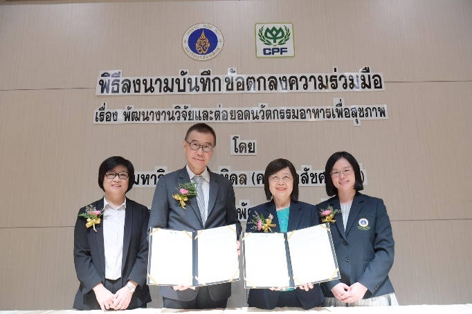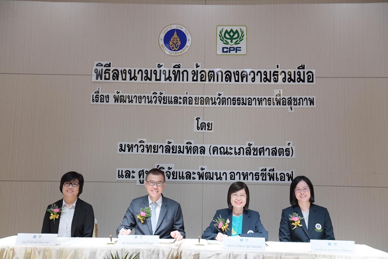รองศาสตราจารย์ ดร.สุวัฒนา จุฬาวัฒนทล คณบดีคณะเภสัชศาสตร์ มหาวิทยาลัยมหิดล และ ดร.สมหมาย เตชะศิรินุกูล รองกรรมการผู้จัดการบริหาร ด้านวิจัยและพัฒนาผลิตภัณฑ์ ซีพีเอฟ ร่วมลงนามบันทึกความร่วมมือด้านอาหาร เรื่องการพัฒนางานวิจัยและต่อยอดวัตกรรมอาหารเพื่อสุขภาพ ตอบโจทย์ความต้องการของผู้บริโภคทุกช่วงวัย สนับสนุนนโยบายของรัฐบาลบูรณาการทำงานของภาครัฐและภาคเอกชน ให้ก้าวไปสู่ ไทยแลนด์ 4.0 และร่วมสร้างความยั่งยืนให้กับสุขภาพของคนไทย